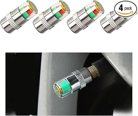 Material of car tire pressure indicator caps: Chromed Metal+PC;Size:1cmX2.5cm;Visually alerts you when the tire pressure is low. Car tire pressure monitor valve caps help to avoid premature tire wear or blowouts from under-inflated tires,increases fuel efficiency, safety and control, extends tire life. Green/yellow/red system indicate level of proper tire inflation.According the recognize color to display the pressure of the tire,Green shows that tire pressure is normal Yellow shows that the pressure is 10% lower than standard Red alerts you that the pressure is 25% lower than standard…
