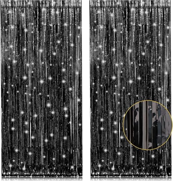 2 Pack 3.2Ft X 8.2Ft Black Tinsel Foil Fringe Curtains, Metallic Foil Tinsel Photo Booth Backdrop Streamer for New Years Decorations Halloween Bachelorette Birthday Holiday Celebration Party Supplies