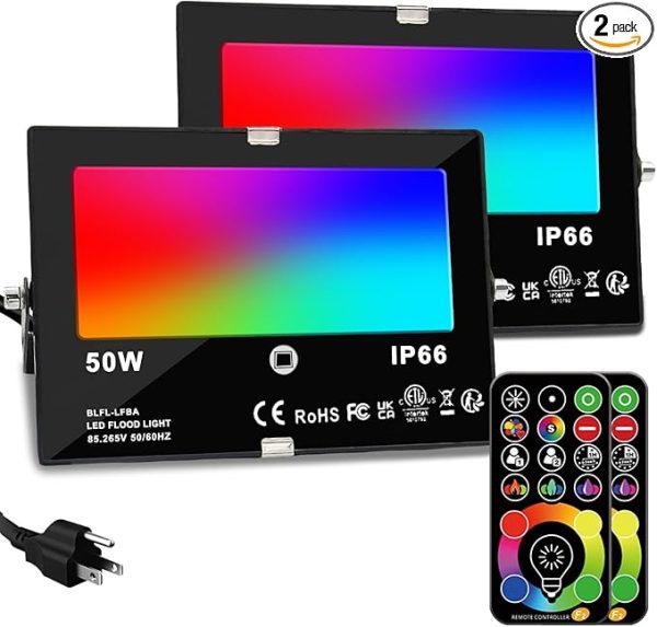Hekee Led Flood Light Outdoor, 50W Rgb Color Changing Floodlight With Remote Control, Rgbw 120 Colors, 2700K, 5000 Lumens, Ip66 Waterproof, Diy Strobe Mode, Timing, for Halloween/Christmas (2 Pack)
