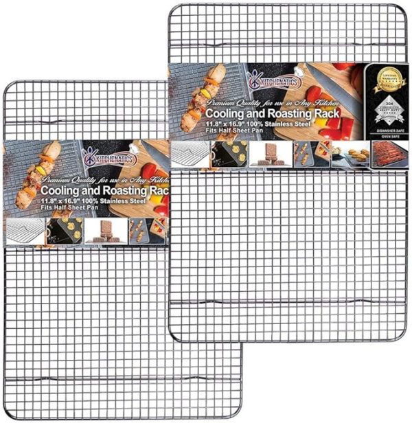 Set Of 2 Half Sheet Baking Rack For Oven Cooking: Commercial grade pure 100% 304 stainless baking steel wire rack for baking, roasting, grilling, broiling, smoking, & more. Our wire cooling rack has no artificial chrome coating, no flaking & no rusting. Wire racks measure approximately 11.8″ x 16.9″ inches with 1″ high legs (Measurements may differ by only a few millimeters).. Ultra Durable Cooling Racks for Cooking and Baking With Patented Welds: The wire baking rack can hold up to 45 lbs of weight on the wire rack without breaking or bending. Our baking sheet rack has 3 support bars and 1-inch height for better heat and air circulation.. Oven, Grill And Dishwasher Safe Wire Rack for Baking Sheet: The baking racks for cooling and cooking are heat-resistant up to 575°F. Easy to clean cookie cooling rack. Simply place each cookie sheet rack in the dishwasher after each use….