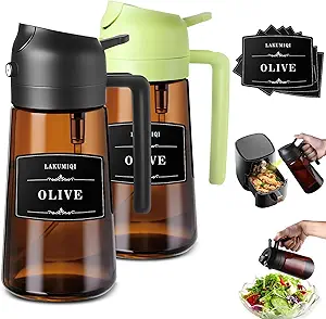 2-in-1 Design Pour & Spray Modes:Flip the switch for pouring mode to drizzle oils precisely on salads or baked goods. Switch to misting mode for air fryers and grills–the leakproof nozzle sprays evenly with no drips.. 8 Stickers & Safe Coating: The olive oil sprayer features a safe exterior coating for durability, with no coating on the interior to ensure safe, pure oil storage. We have prepared 8 exquisite stickers for each oil dispenser sprayer: OLIVE, SESAME, COCONUT,CANOLA, AVOCADO, WALNUT, VEGETABLE, GRAPESEED.. Mess-Free Oil Control & Diet:16oz size with measurement marks helps track calories–perfect for keto or low-fat diets. The snap-lock lid prevents spills, while the food-safe silicone tube filters out oil residue….