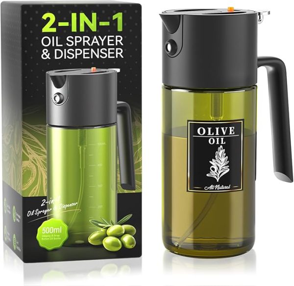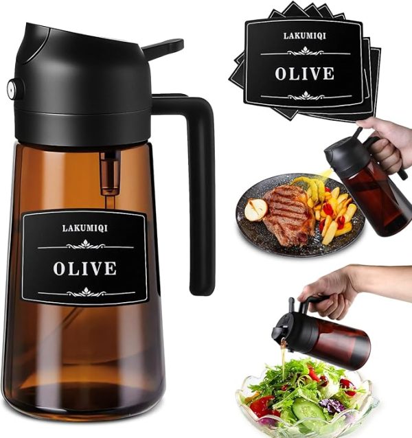 Upgraded Brown Light-Blocking Kitchen Upgraded Made 2 in 1 Oil Dispenser: Upgraded the light blocking feature on top of the transparent spray bottle, upgrading the bottle body to brown. After research, brown is the color with the best light blocking properties.. 8 STICKERS & SAFE COATING: The olive oil sprayer for cooking features a safe exterior coating for durability, with no coating on the interior to ensure safe, pure oil storage. We have prepared 8 exquisite stickers for each oil dispenser sprayer: OLIVE, SESAME, COCONUT,CANOLA, AVOCADO, WALNUT, VEGETABLE, GRAPESEED.. Easy TO USE: This two in one olive oil spray with a buckle design is very easy to use. Pouring oil: Open the buckle and gently pour it out, and the oil will flow smoothly from the pouring port. Spray: press the spray button towards the food (after the first use, press several times to empty the air in the silica gel catheter, the oil will enter the catheter, and then spray out), salad, steak, barbecue will enjoy an olive oil bath….