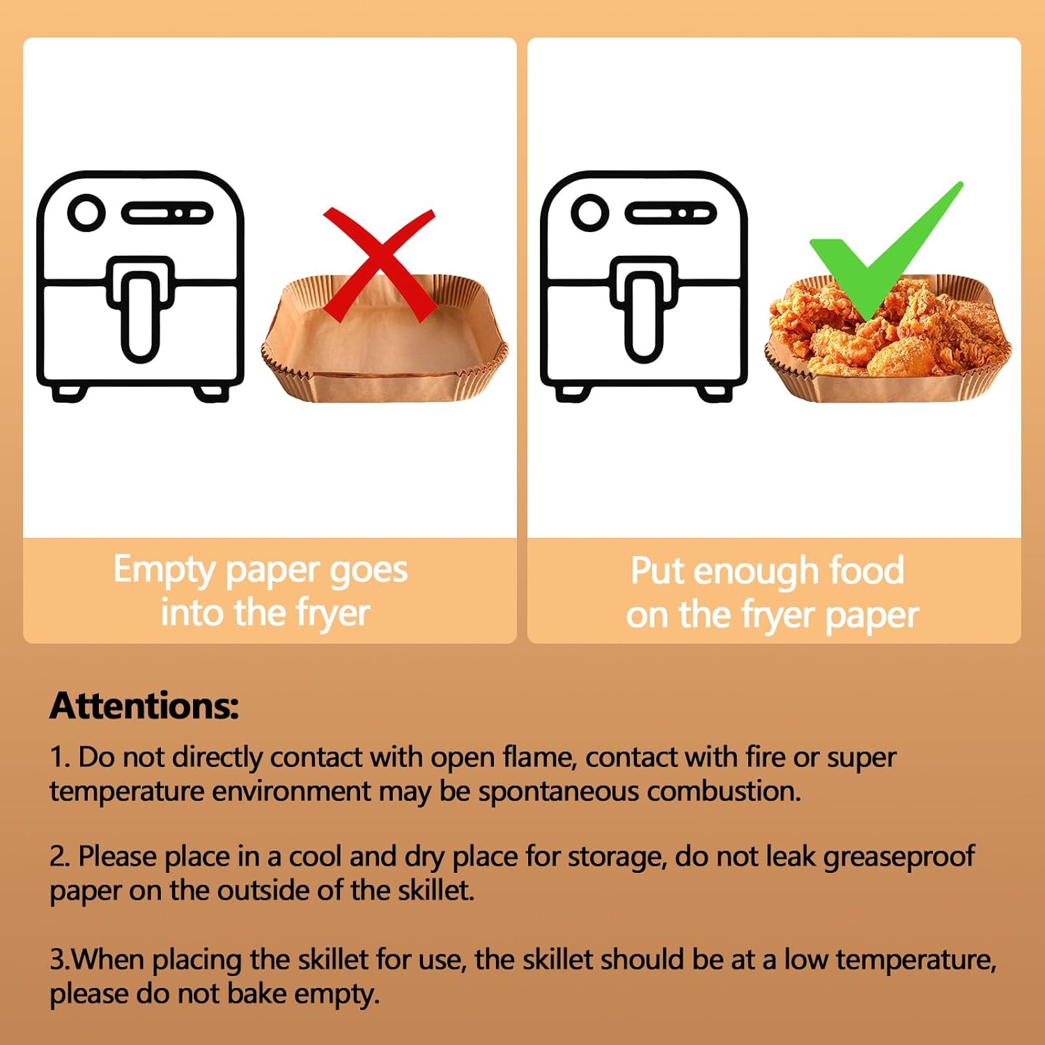 - [OIL AND WATERPROOF]: The air fryer papers are coated with a unique oil and waterproof coating that effectively blocks grease penetration and also prevents moisture from seeping in, our square air fryer liners will keep your fryer clean and sanitary.