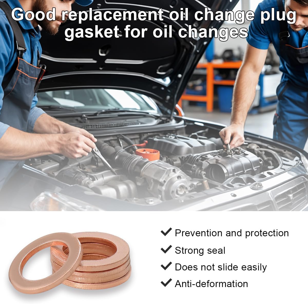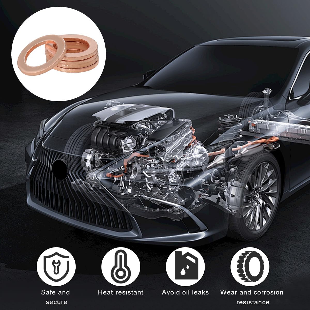 【Practical Functions】: This gasket can protect the vehicle’s differential and transfer case, ensuring a safe and leak-free seal every time the vehicle’s oil is changed. Regularly replacing the drain plug gasket can reduce the risk of oil leakage, ensure the normal operation of the engine, and greatly improve driving safety.. 【Sealing & Anti-Leakage】: The oil drain plug gasket is tightly connected and fits flat. It is designed and manufactured according to the original gasket and can be directly installed on your car to provide a tighter and safer fit. Compared with plastic and steel gaskets, it can guarantee a long-lasting seal to prevent leakage.. 【High Quality Material】: Oil drain plug gasket is made of high-quality copper material, which is corrosion-resistant and resistant to high and low temperatures. Its surface is smooth and wear-resistant, with good sealing performance, and it is not easy to wear out after long-term use….