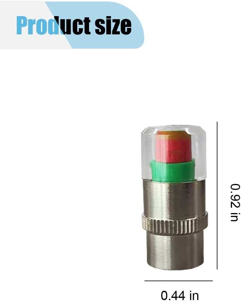 【Reliable Quality】:This car tire valve stem cap is made of stainless steel and plastic, with a built-in copper core. It is sturdy and wear-resistant, not easy to deform, corrosion-resistant, and heat-resistant.. 【3-Color Display】:This car tire pressure monitor valve stem cap will display three different colors, green, yellow, and red respectively. Green means the tire pressure is normal, yellow means the tire pressure is 10% below the standard value, and red means the tire pressure is 25% below the standard value.. 【Functions】: This car tire valve stem cap can protect the tire valve from erosion by rain, dust, sand, etc. It can also accurately monitor the tire pressure in real-time to avoid wear and tear, flat tires, and other problems, prolong the life of tires, and effectively improve the fuel efficiency of the locomotive, the stability of the tire, and the safety of driving….