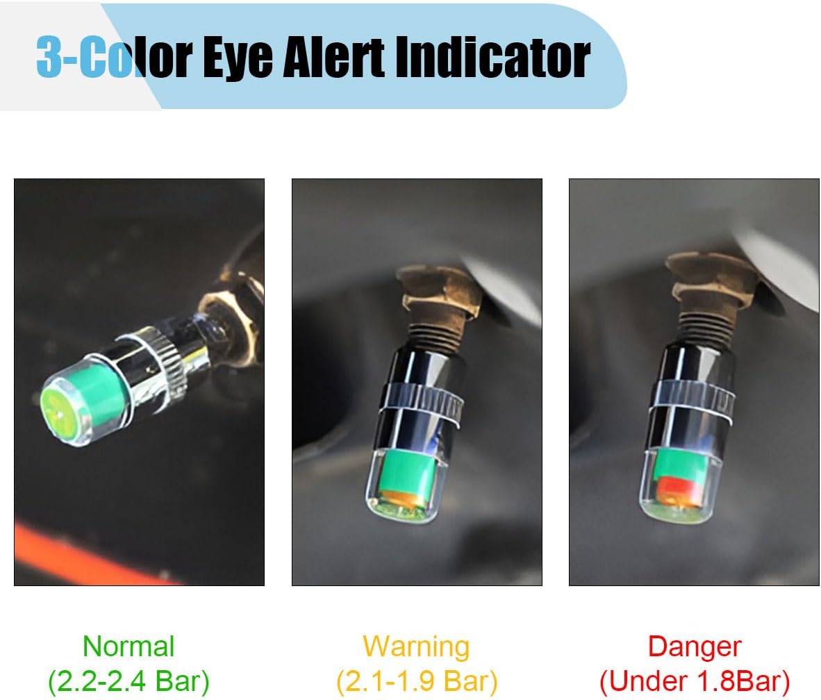 -This car tire valve stem cap 3-colour display design can help you always know the air pressure of your tyres and inflate your tyres in time.