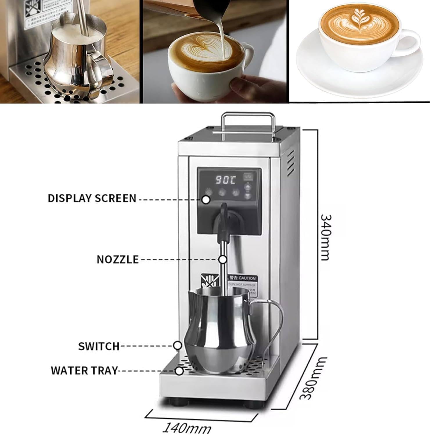 Large Capacity:Featuring a removable 800ml water tank, this milk frother can be easily filled directly from a water source. Steam up to 500ml of milk or froth up to 300ml in a single use, ideal for preparing multiple cups at once.. Materials:Made of premium stainless steel, this electric milk frother is equipped with a 500ml milk jug and a removable water tray. The alloy water tray and plastic coating resist coffee stains, while the smooth surfaces ensures easy cleaning.. Adjustable Steam Wand Angle:Equipped with a thermostat and a pressure pump, this frother produces rich, creamy milk foam. The adjustable steam wand tilts to your liking for a personalized frothing experience….