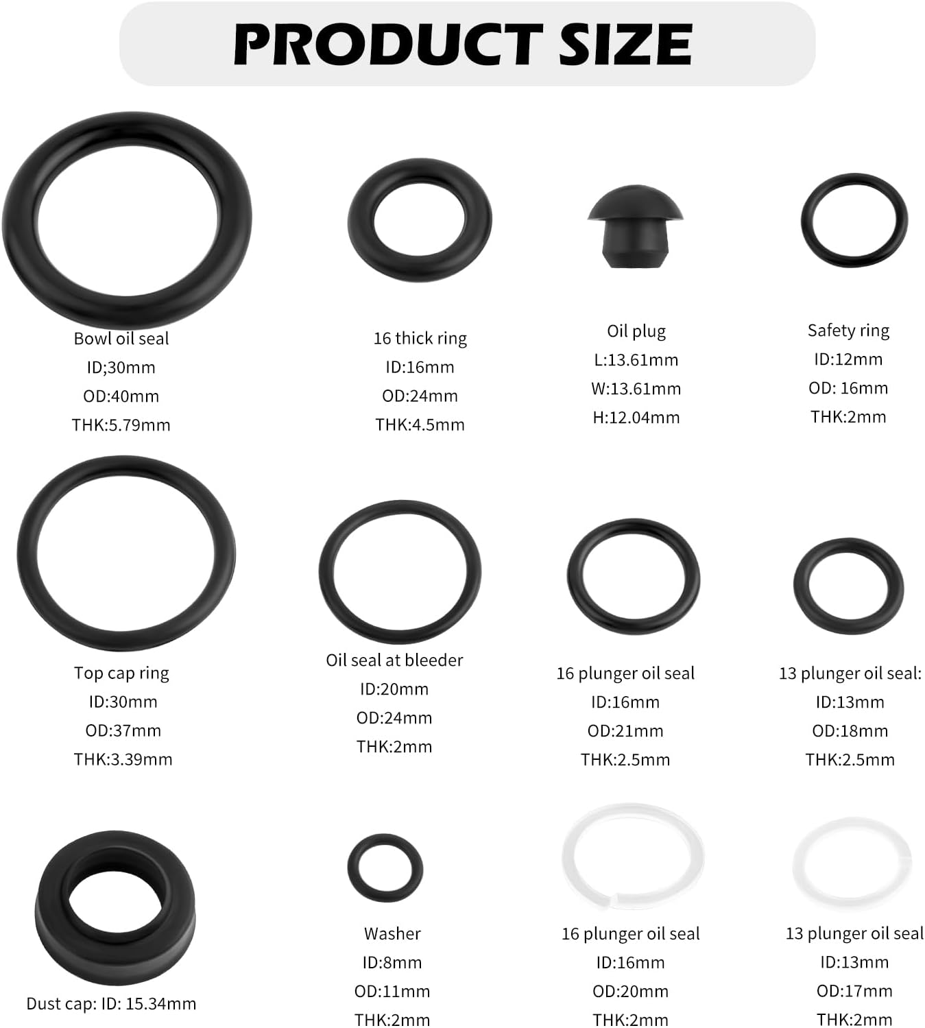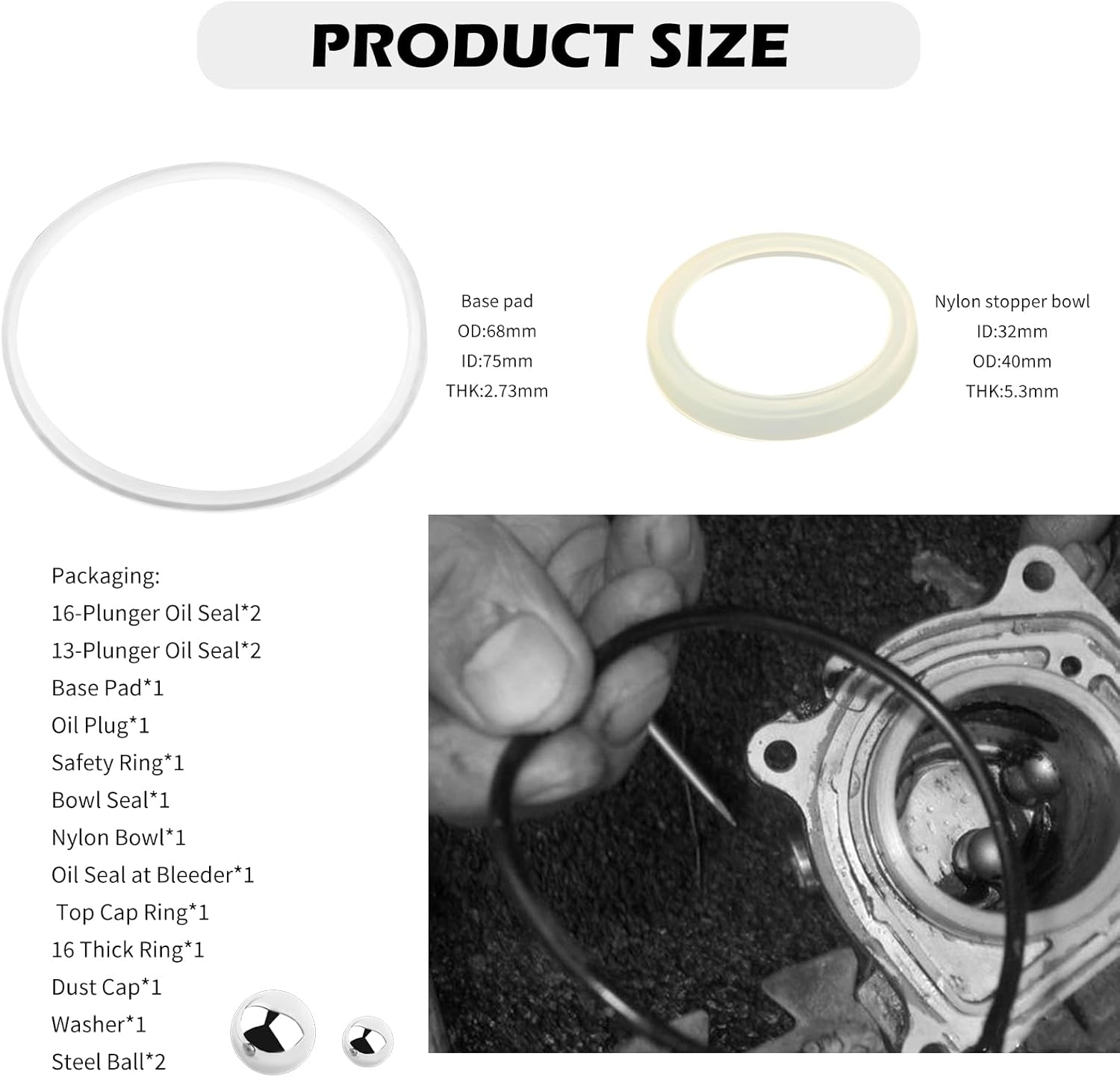 Full Kit: Includes a total of 16 fittings, including plunger oil seals, oil plugs, nylon retaining bowls, cap rings and more. The oil seal keeps oil from spilling out, and the cap ring seals the plunger and maintains a seal with the cylinder