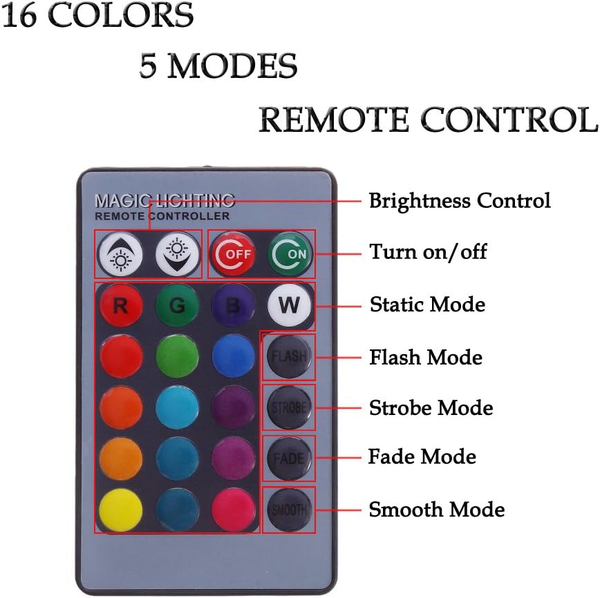 - Features: 16 colors and 5 modes (ordinary, flash, strobe, fade and smooth) are easy to switch by remote control.