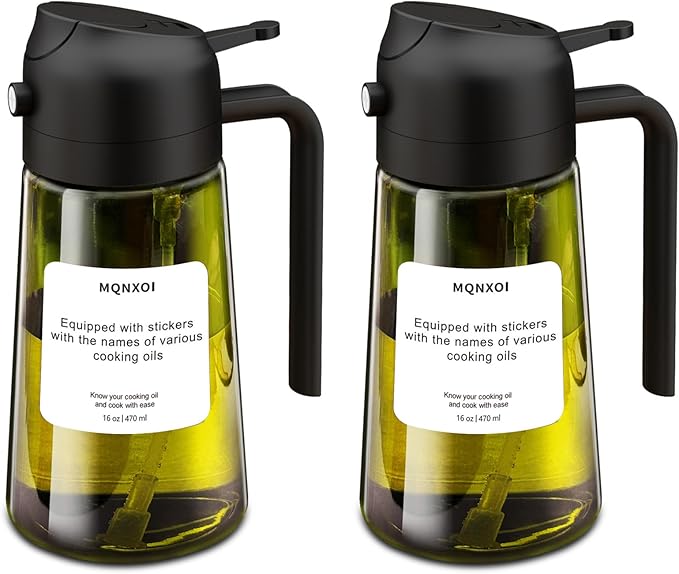 - 2 in 1 Oil Dispenser and Sprayer: Experience versatility in your kitchen with our innovative oil dispenser for kitchen, serving as both an olive oil dispenser bottle and oil sprayer for cooking. Seamlessly switch between pouring oil and spraying a fine mist with a simple adjustment, enhancing your culinary experience with ease and efficiency