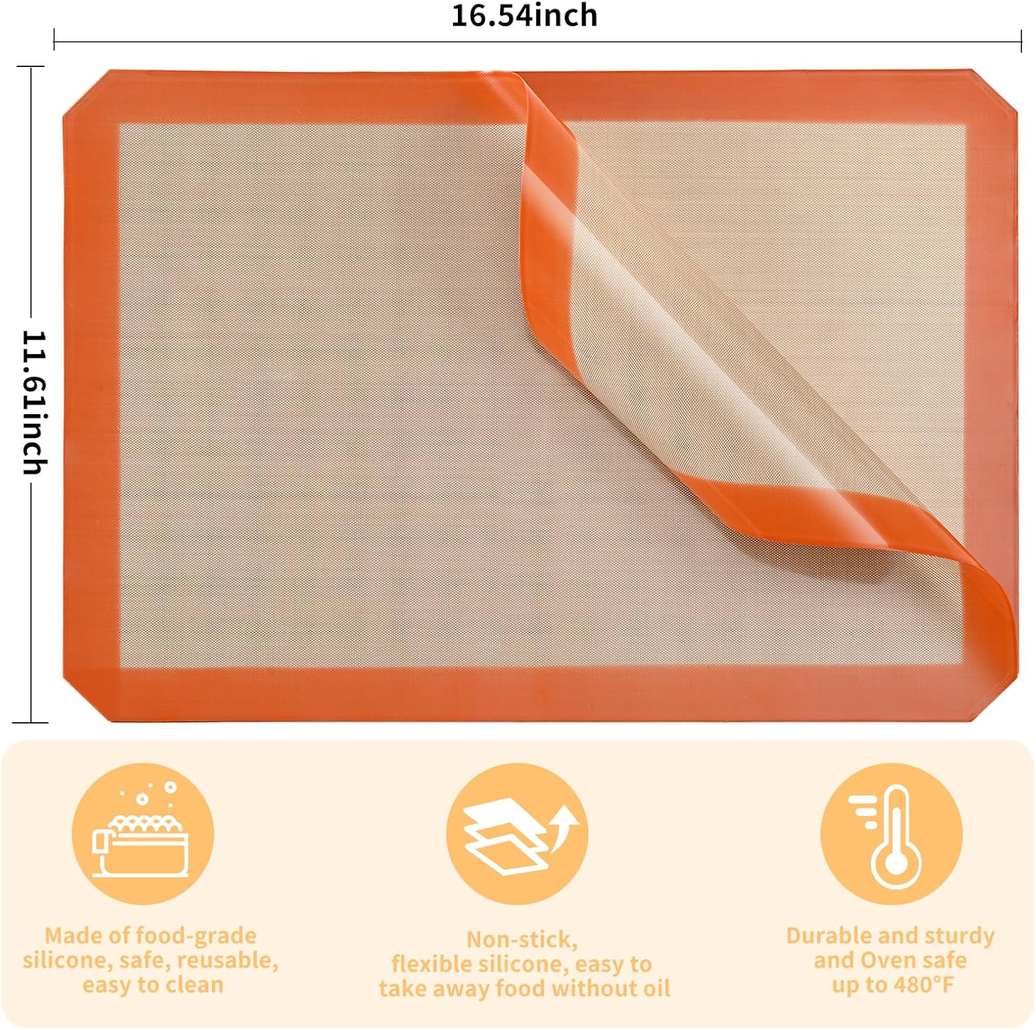 Perfect Fit for Half Sheet Pans: Sized at 16.54″ x 11.62″, these reusable silicone baking mats fit all standard half sheet trays. Ideal for baking cookies, bread, pastries, or roasting vegetables — no parchment paper or foil needed.. Thin, Flexible & Easy to Handle (0.4mm): Crafted from durable 0.4mm BPA-free silicone, these mats are lightweight, flexible, and easy to roll or store. Great for everyday use in busy kitchens or for beginner bakers.. Non-Stick Surface for Effortless Baking: Enjoy non-stick baking without oils, sprays, or butter. Food slides off easily, making these mats perfect for sticky doughs, caramel, cheese, and more….