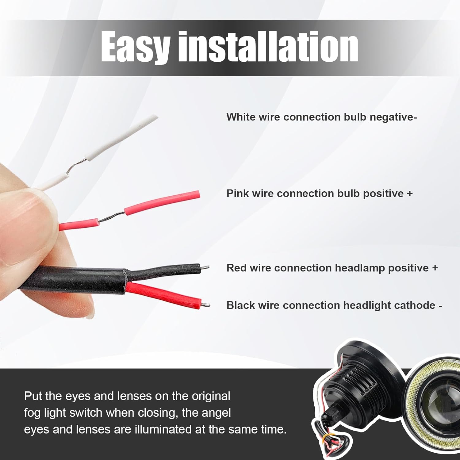 【Super Bright】: 8000 lm ultra-bright light, high-power lighting output, able to easily penetrate and illuminate darkness. Not only can it light up the road in the dark and bad weather, so you can see the road clearly and drive carefully and safely. It also enhances your car’s visibility, allowing other cars and pedestrians to notice your car, increasing alerts and avoiding tailgating and collisions.. 【High Quality】: Using excellent COB LED chips, high brightness, energy saving, high power and low heat generation. The ABS plastic shell is sturdy and durable, with a sealed design and good waterproof performance, making it difficult to short circuit. The metal bracket has high strength and is not easy to rust. The product can suffer from bad weather and can be used for a long time.. 【Personalized Design】: This car angel fog light has a unique design and streamlined dazzling appearance.It comes with 6000k cold white light LED chips plus colored angel eye halo rings, you can choose your favorite among 7 colors. No matter which color, it looks good and bright. Modify your fog lights to reflect your personality and aesthetics….