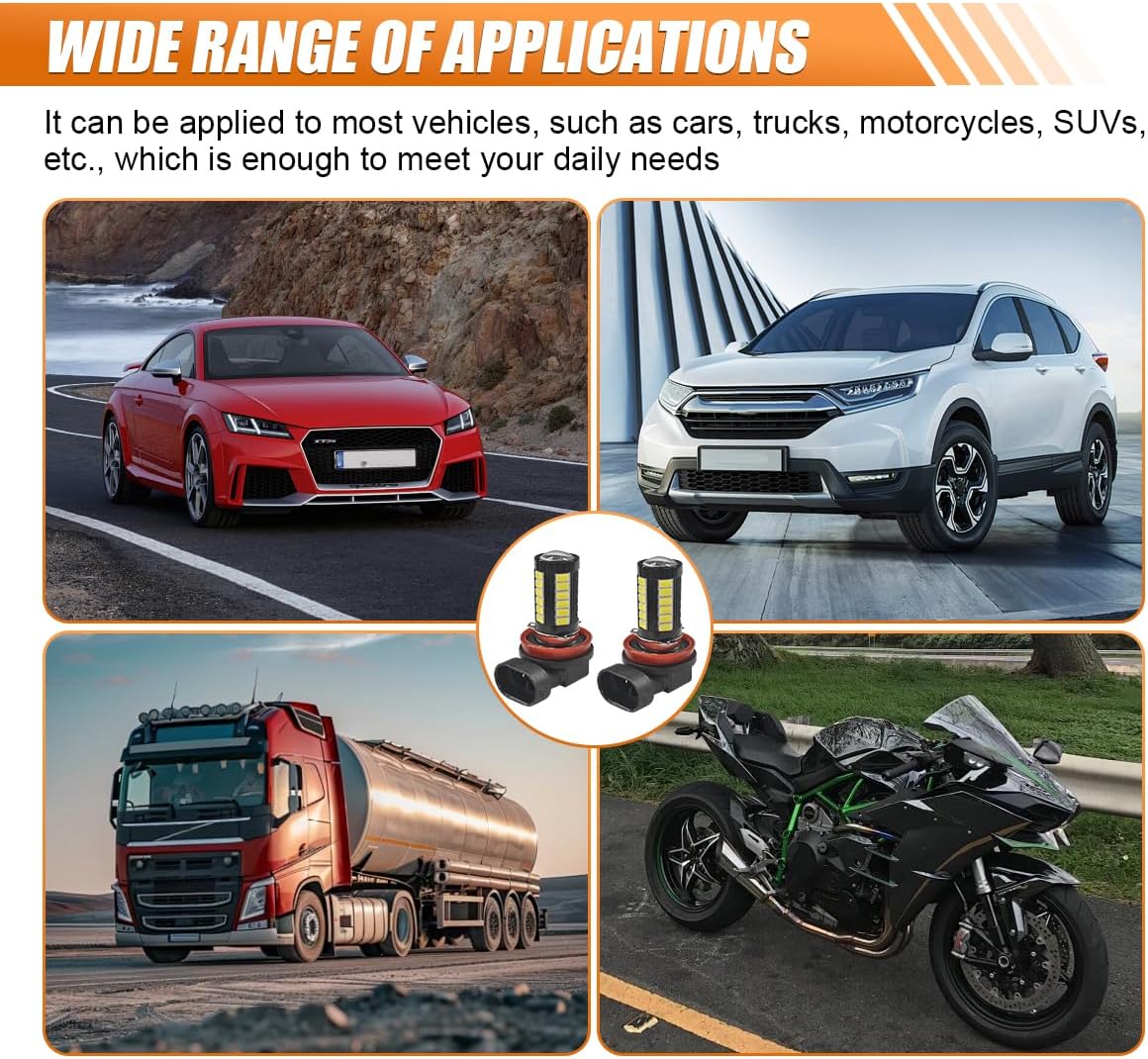 - 【Size Specifications】: The car LED front fog lights have dimensions of 1.81 × 1 × 2.33 inches, with a model of H11, suitable for a voltage of 12V, and a color temperature of pure white light at 6500K. Please carefully check whether the vehicle model and the size specifications of the fog lights match.