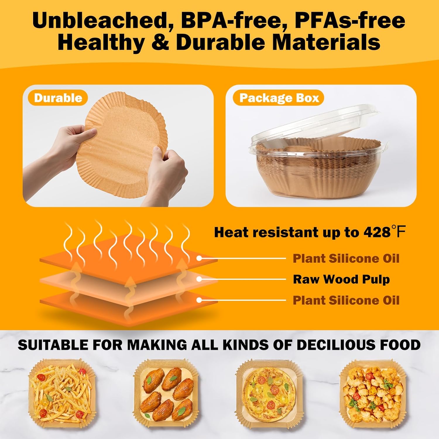 Unbleached & Food-Safe- PFAS-Free & No Chemical Smells! Umite Chef Unbleached parchment liners is Healthier Than Bleached White Paper! Natural brown, unbleached paper with zero chemical coatings (PFAS/PFOA-Free). Withstands 428°F/220°C safely – no burning or odd smells! Grease-resistant barrier locks in juices without staining baskets. Food-grade certified for direct contact with meats, veggies & baked goods, Raw pulp material only!