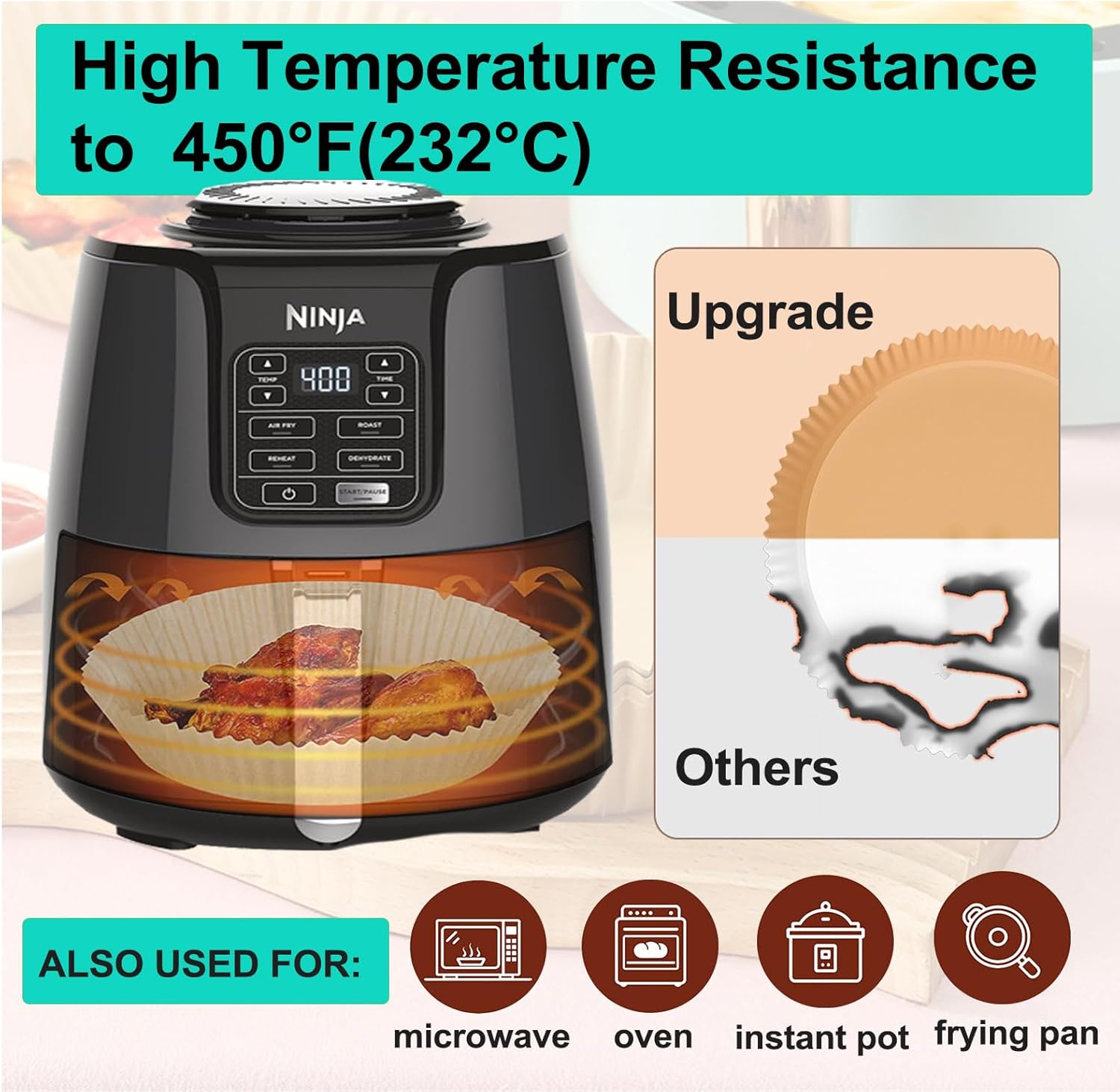 Compatible with ninja foodie air fryer: Custom-designed for the Ninja AF101 Air Fryer Ninja AF150Air Fryer XL Ninja AF161. Get 200 air fryer liners for Ninja Airfryer in one pack!. Healthy Materials: Air fryer liners disposable round are made out of unbleached, natural wood pulp, with a plant based oil treatment, no fluorescent agent, BPA-free, PFAs-free. 12% thicker than ordinary parchment to be durable and sturdy, and won’t tear when lifting even after cooking. Heat resistant up to 450℉/230℃.. Easy to Use: The round air fryer liners are designed with a round bowl shape, which do not need to tear, fold, cut, nor bend, and you can directly put it in when you are ready to cook….
