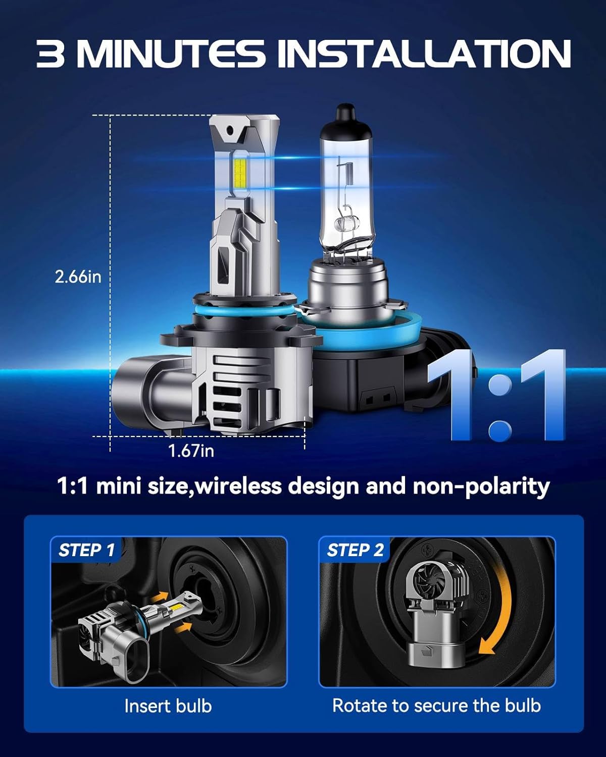 3 Min Quick & Easy Installation: HB3 Bulbs tool-free, plug-and-play in under 3 minutes. Compact design fits factory sockets perfectly, no polarity worries. DIY your lighting enhance in 3 minutes, saving time & hassle. Enjoy a brighter drive instantly