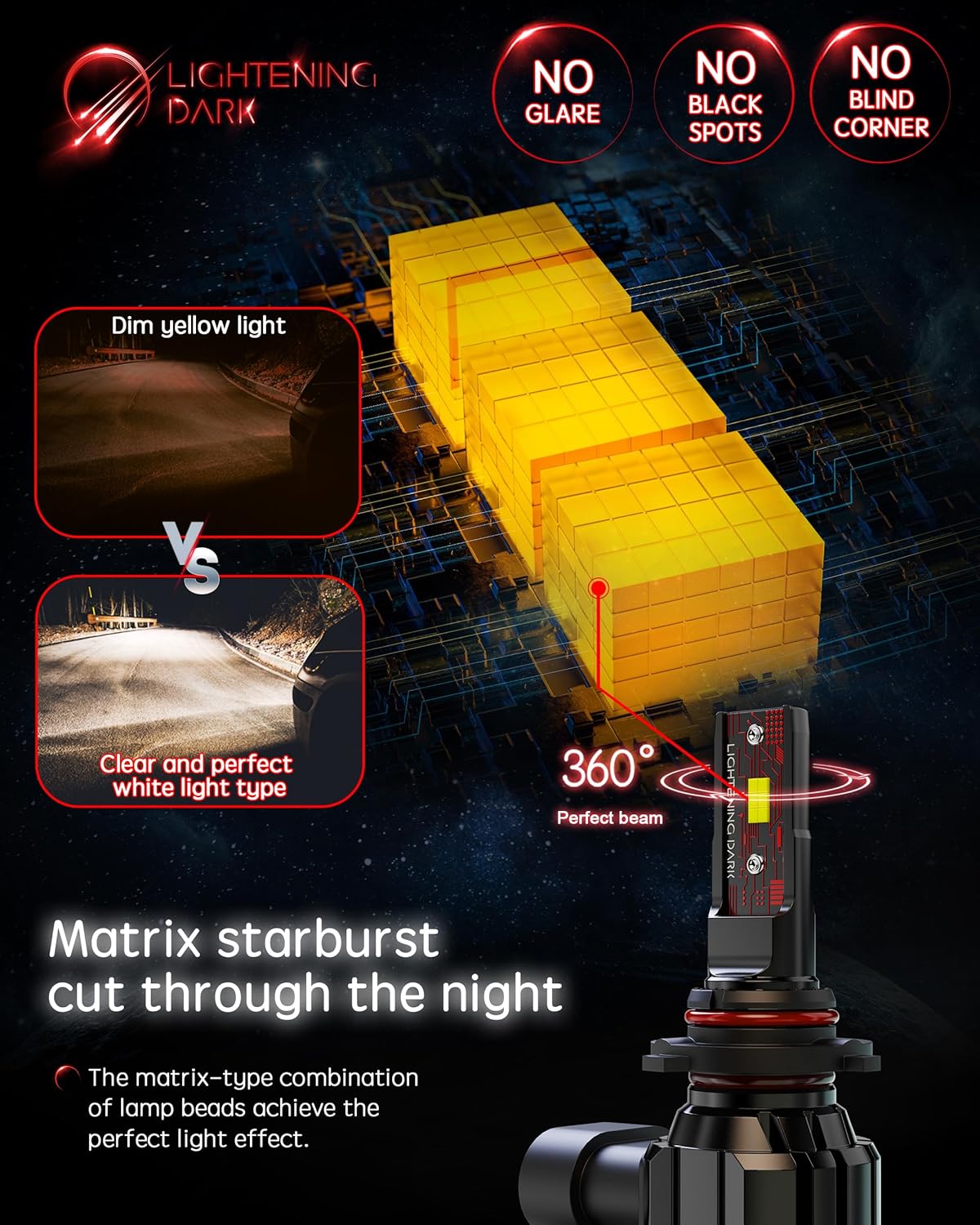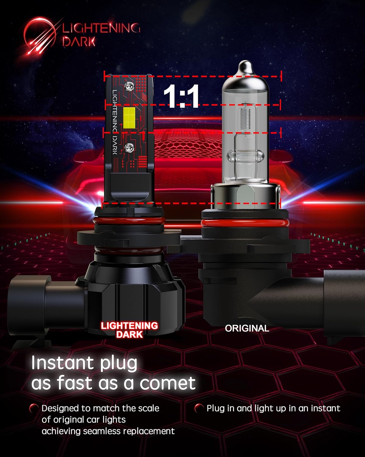 - [Easy installation]: LIGHTENING DARK light bulb designed to match the scale of original car lights, also fit for ATV/UTV powersports light. Restore wireless instant plug design, no need to modify the dust cover of the original car, achieve quick replacement in 10 minutes. Smaller, simpler, and more convenient