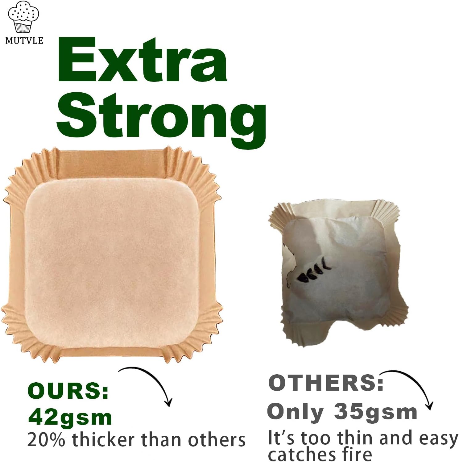 - Healthy Materials: Ninja crisper air fryer liners disposable are made out of unbleached, natural wood pulp, with a plant based oil treatment, no fluorescent agent, BPA-free, PFAs-free. 12% thicker than ordinary parchment to be durable and sturdy, and won’t tear when lifting even after cooking. Heat resistant up to 450℉/230℃.