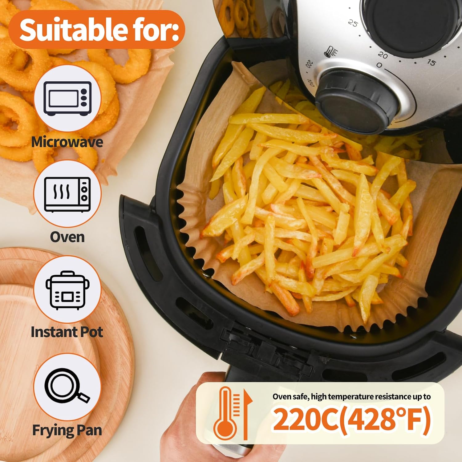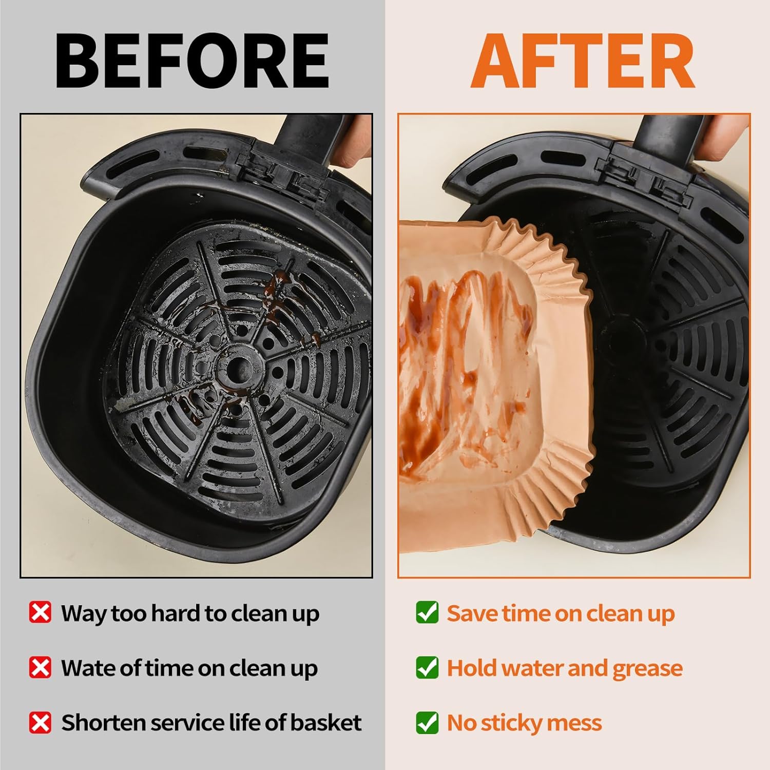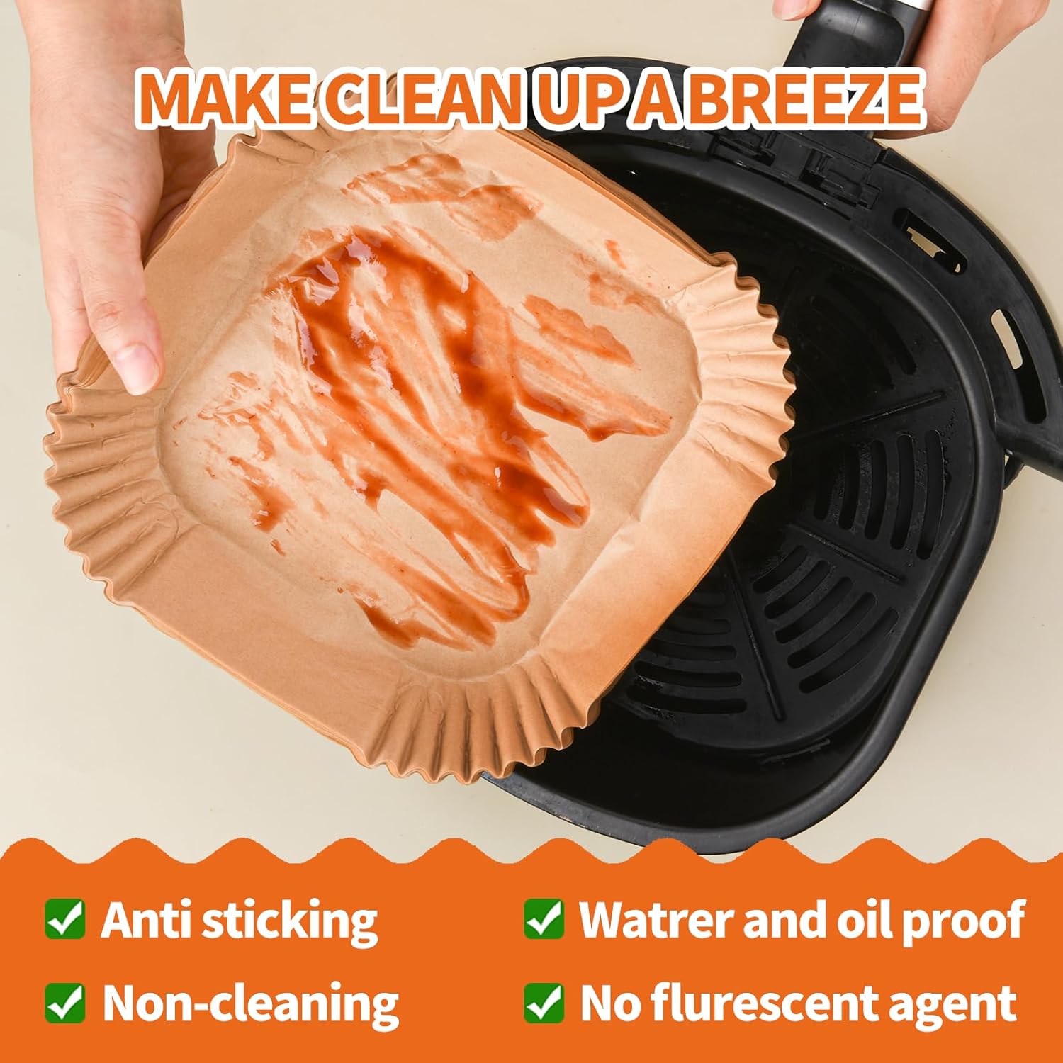 - 【100% Healthy Material】PABUES Square air fryer liners are made of food grade parchment with double-sided silicone Oil. They are waterproof, oil-proof, non-stick, 100% healthy and they can withstand temperatures up to 428 °F.