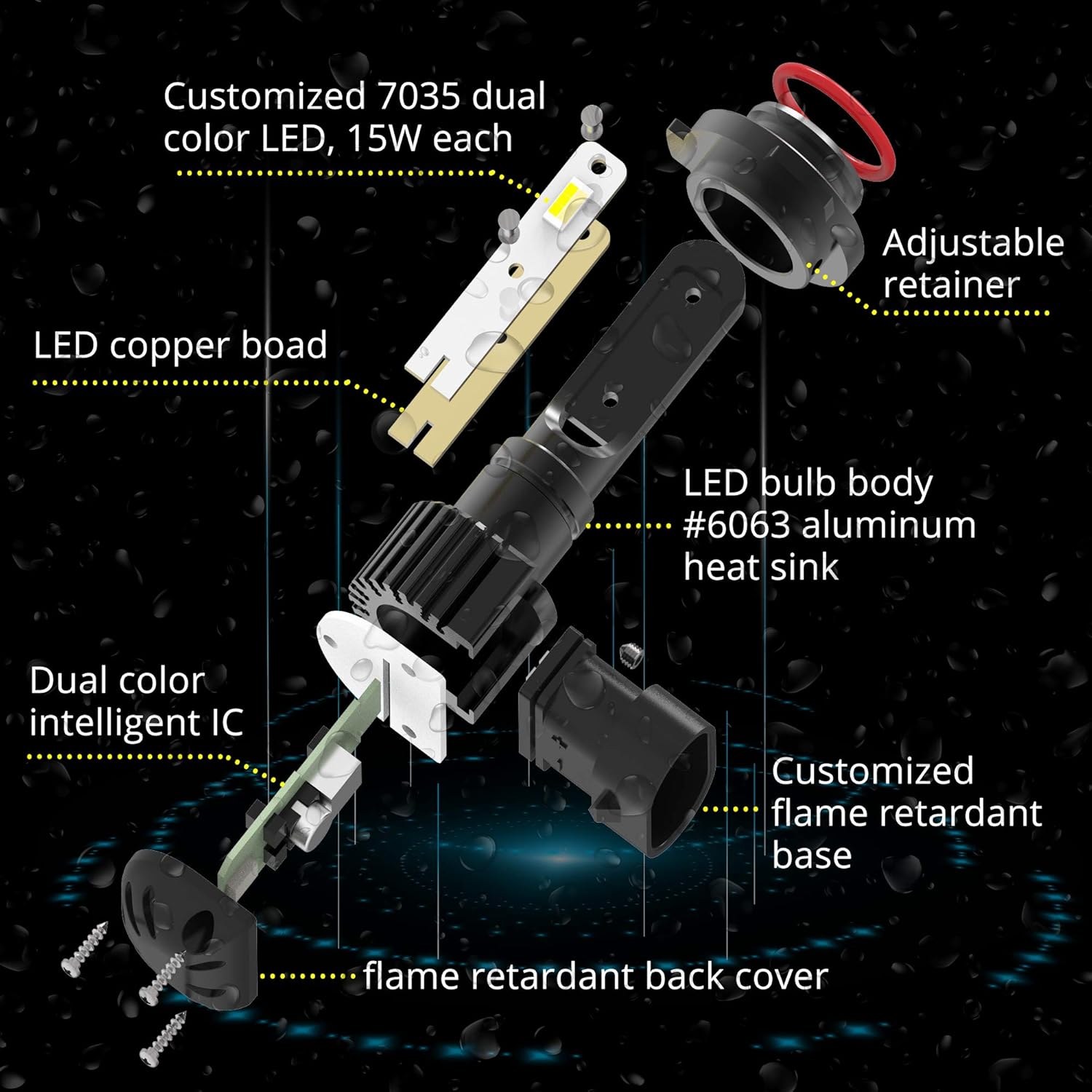 - Dual-Color: 6000K Xenon White/3000K amber yellow; Easily switch color by power on and off of the fog light switch. Powered by Advanced Bright LED Circuitry Technology; Working Voltage: 12V~18VDC.