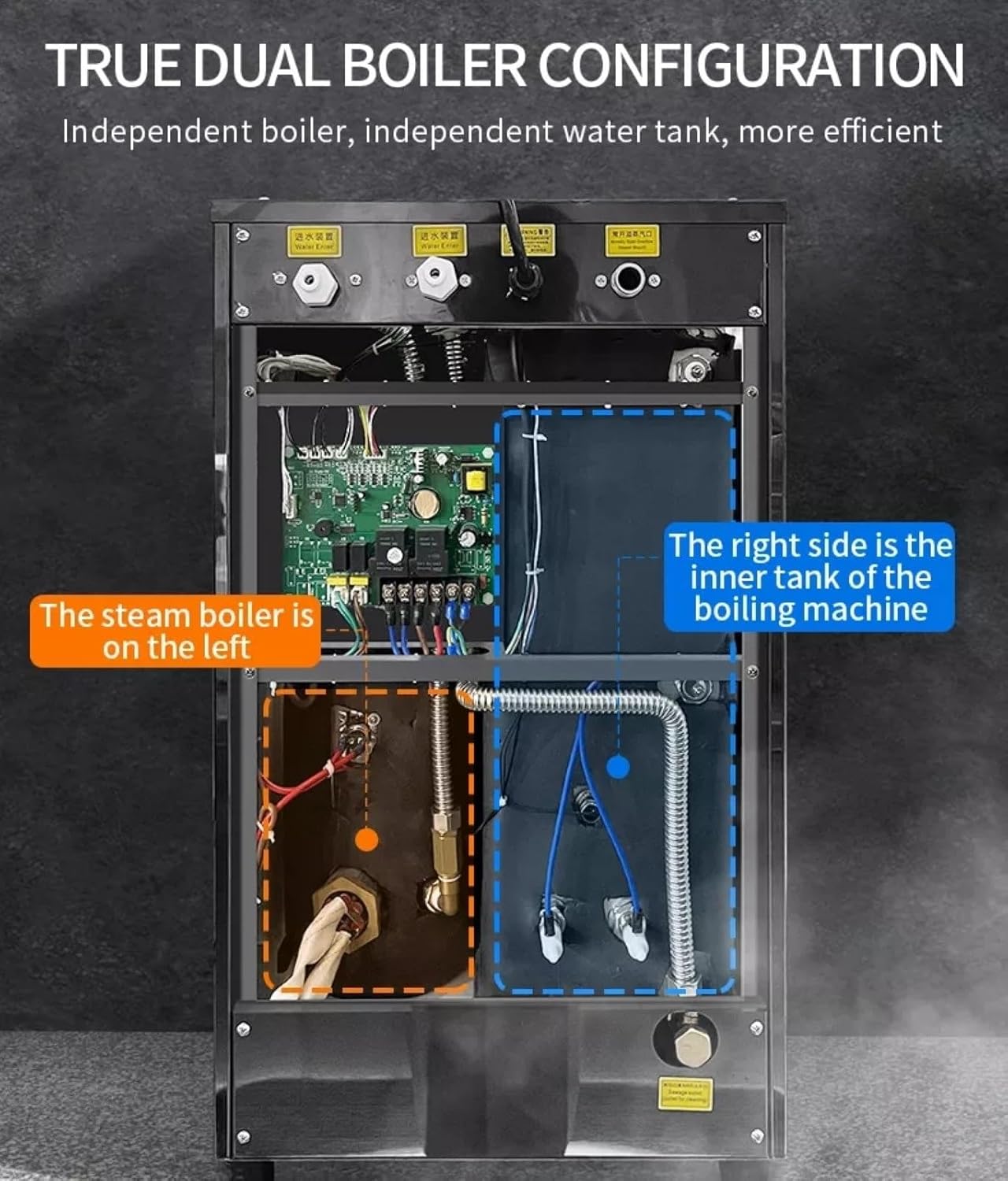 【High-quality Material】The milk frother is made of high-quality stainless steel, which is sturdy and durable. Equipped with an induction suction booster pump, it is suitable for various bottled water and tap water or water sources with low water pressure. When using for the first time, it is recommended to add water to boil and clean before use.. 【Safe to Use】The electric milk frother adopts 32-bit embedded waterproof, dustproof, and moisture-proof circuit board, and the heat sink can enhance the internal air circulation and prolong the service life. It has high temperature resistant pressure protection and automatic pressure relief protection to ensure safety.. 【Efficient Work】This milk frother has a power of 3000W and fast heating speed. 50L/h gallon capacity can provide you with multiple cups of hot water and delicious coffee at one time. High-pressure double boiler technology, steam and boiling water are independent, ensuring continuous supply of steam and boiling water….