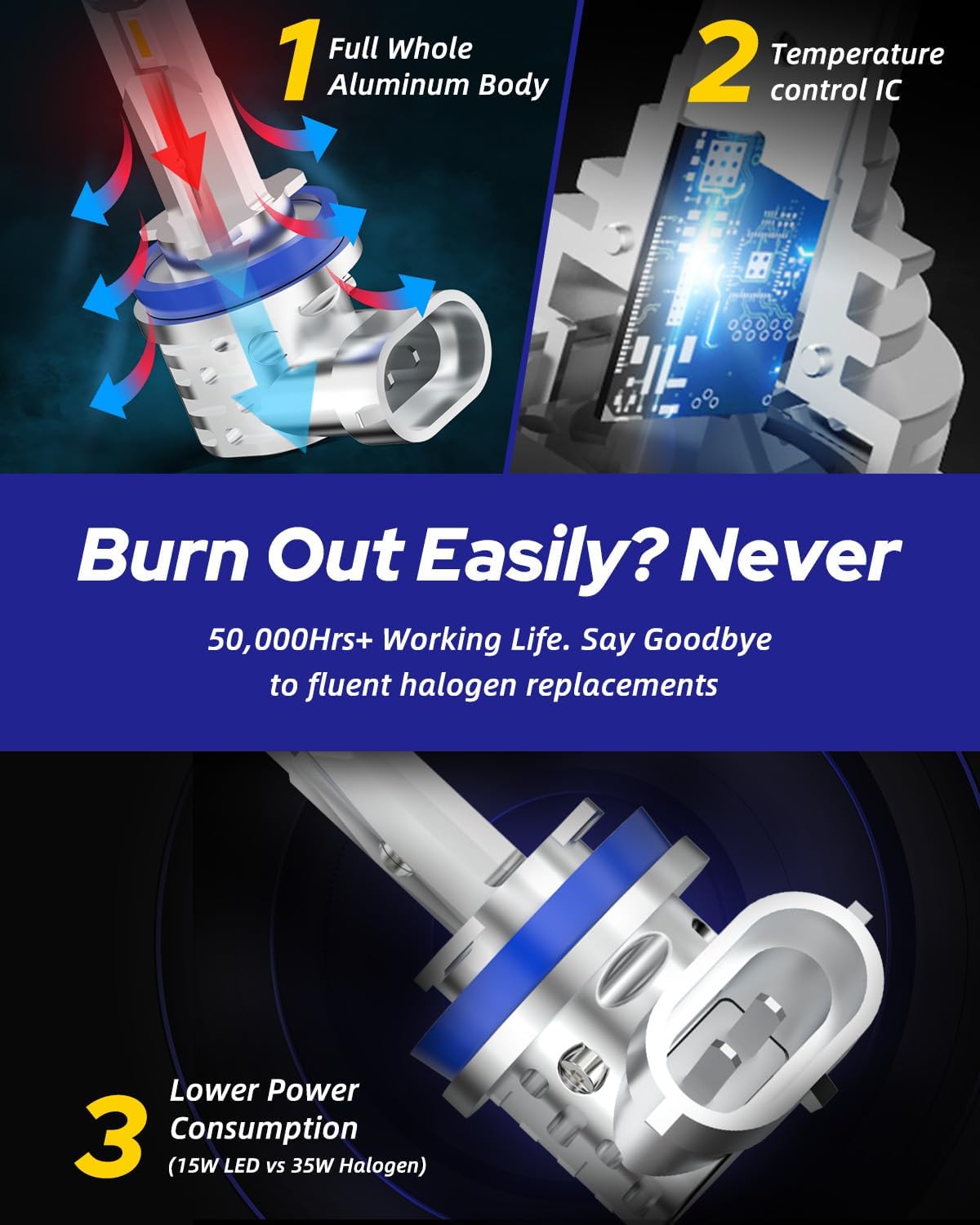 【50000+ Hours Lifespan】-Top-grade aviation aluminum heat sink design and intelligent temp control for heat dissipation ensure H8 LED fog lights much longer lifespan up to 50000 hours
