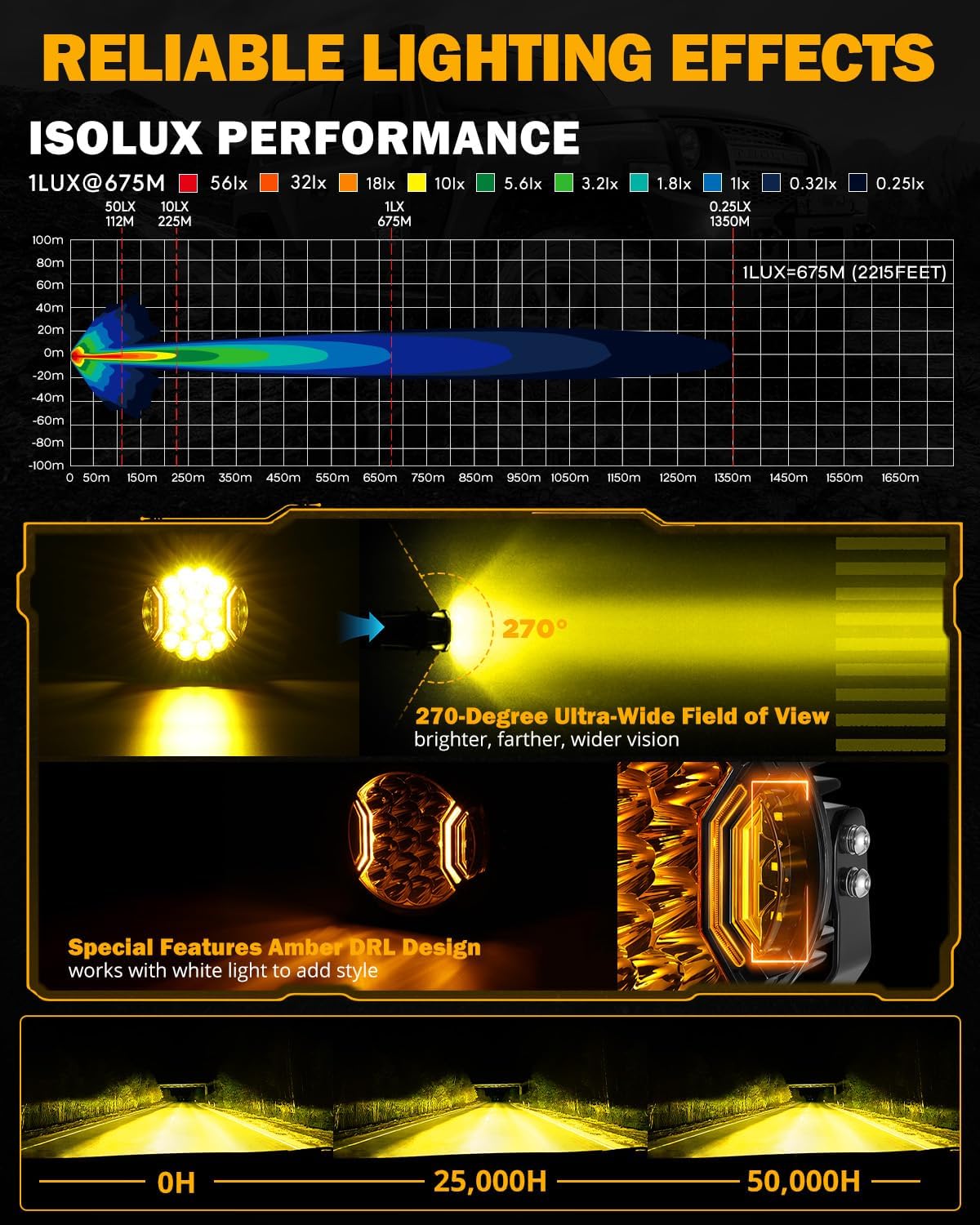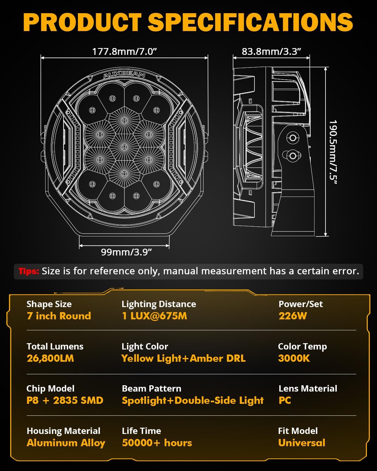 【TRUSTWORTHY VISUAL BRIGHTNESS】Employ industry-leading P8 LED chips, total outputs 226W of power, emitting a super bright 26800LM and remarkable 500% increase in luminous flux, bring a new experience to our travel. besides, High-efficiency reflective cup design ensures focused lighting, eliminating blind spots and guarantee driving safety to the greatest extent.. 【SUPERIOR DRIVING VISION】Moving beyond traditional LED lamps that only offer front lighting, we’ve innovatively added a double side light design to our product. Combined with the hyper spot light beam, it provides a comprehensive 270-degree light coverage, ensuring clearer, wider, and further visibility.. 【MULTIFUNCTIONAL & COST-EFFECTIVE】The LED driving lights provide 3 different lighting modes, you can choose different ambient lighting, including Yellow Main Light, Amber DRL or Turn Signal. We also provide two black protective covers. Not only do they enhance your vehicle’s style and off-road appeal, but they also ensure compliance with state regulations and DMV inspections, keeping your lights road-legal….