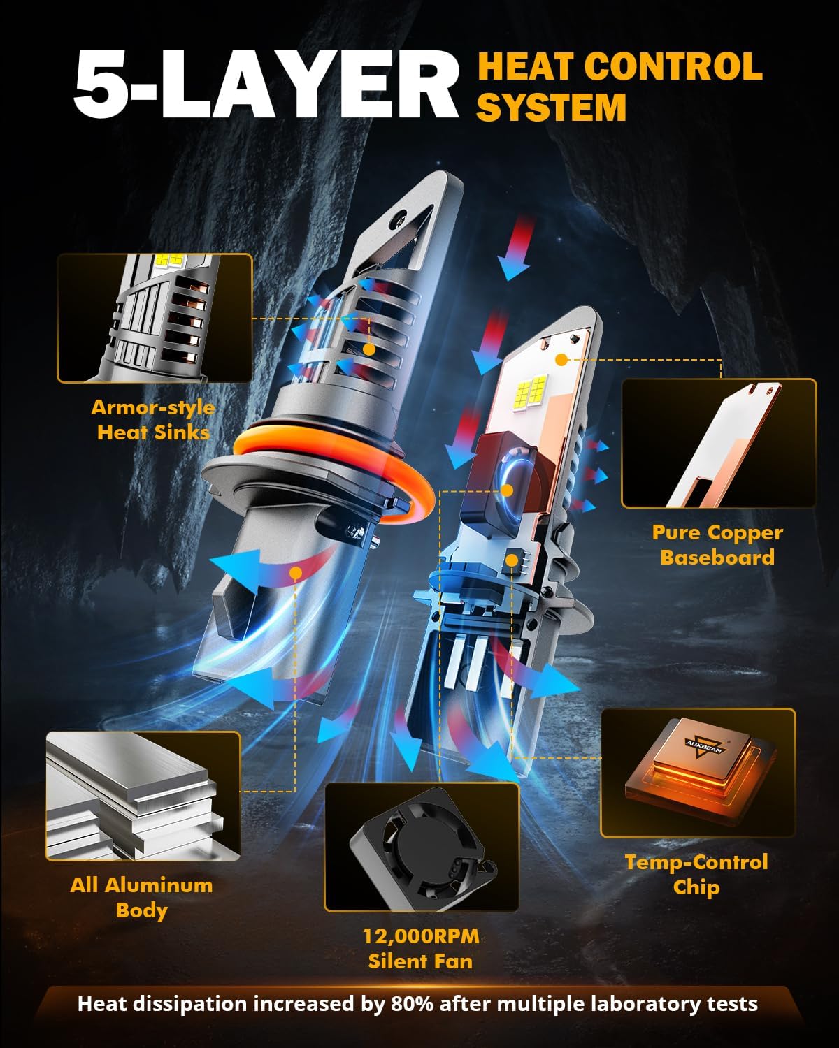 TEMP CONTROL SYSTEM: Designed with built-in latest temp control chips, 12,000RPM 9-blade silent fan, pure copper baseboard, all 6063 aviation aluminum lamp body, armor-style heat sinks. Directly improves 80% heat dissipation and gain an extend service life over 50,000 hours.