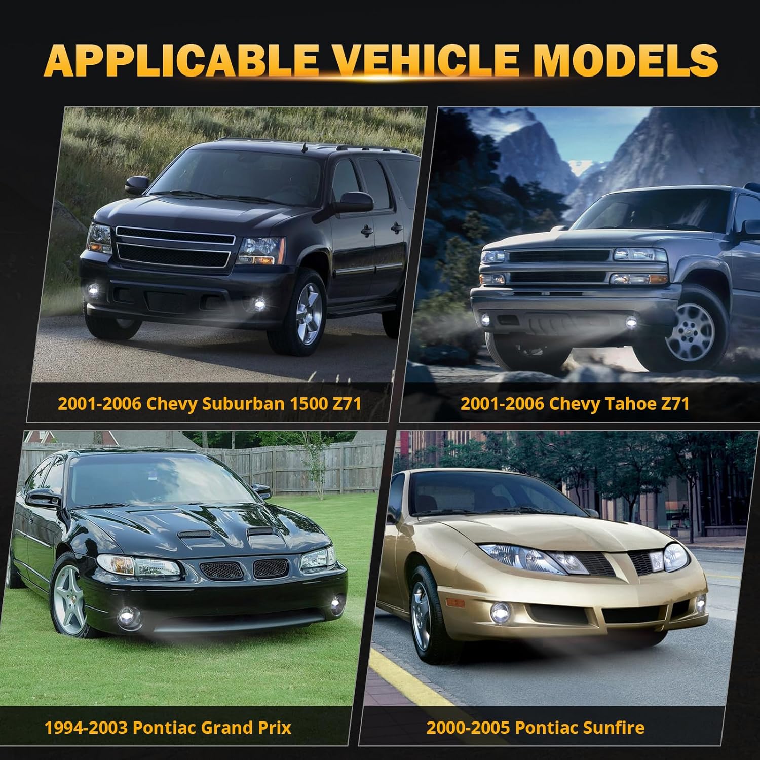 【FITMENT】Compatible with 2001 2002 2003 2004 2005 2006 Chevy Suburban 1500 Z71, 2001-2006 Chevy Tahoe Z71, 2000-2005 Pontiac Sunfire, 1994-2003 Pontiac Grand Prix.. 【Crystal Clear Cutoff】LED fog lights feature meticulously engineered cutoff design, ensuring sharp, glare-free boundaries for precise illumination. Navigate confidently with focused brightness.. 【Brilliant Brightness】 Equipped with premium PC lenses, auxbeam fog lights provide crystal-clear optics and precise light distribution. The high-output fog lights penetrate through fog or adverse weather, enhancing your driving safety….