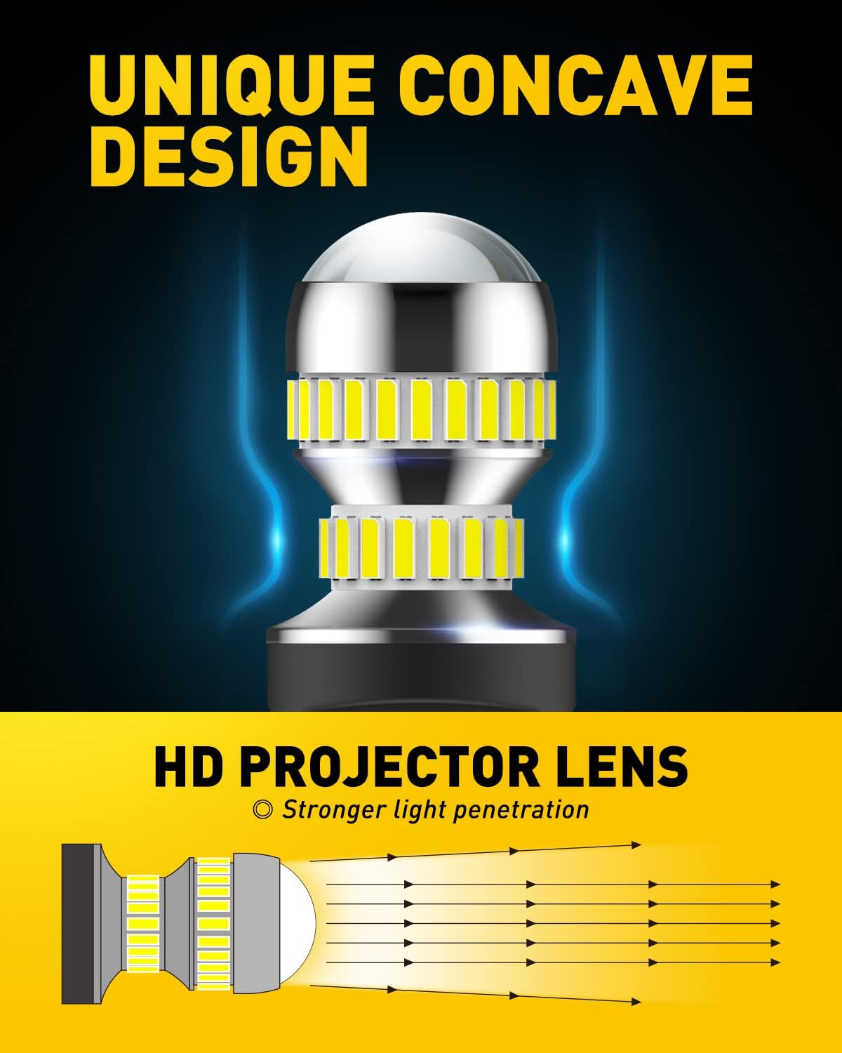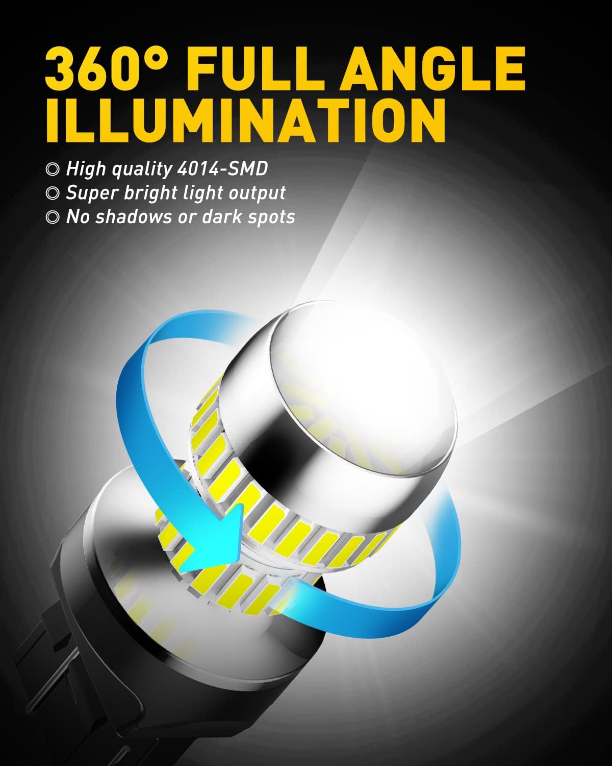 - Resembling halogen bulb shape design and sequencing 54 4014-SMD LED chips precisely around the bulb. Delivering 360° high luminous efficiency with full 6000K white light, see more clearly and safely when reversing