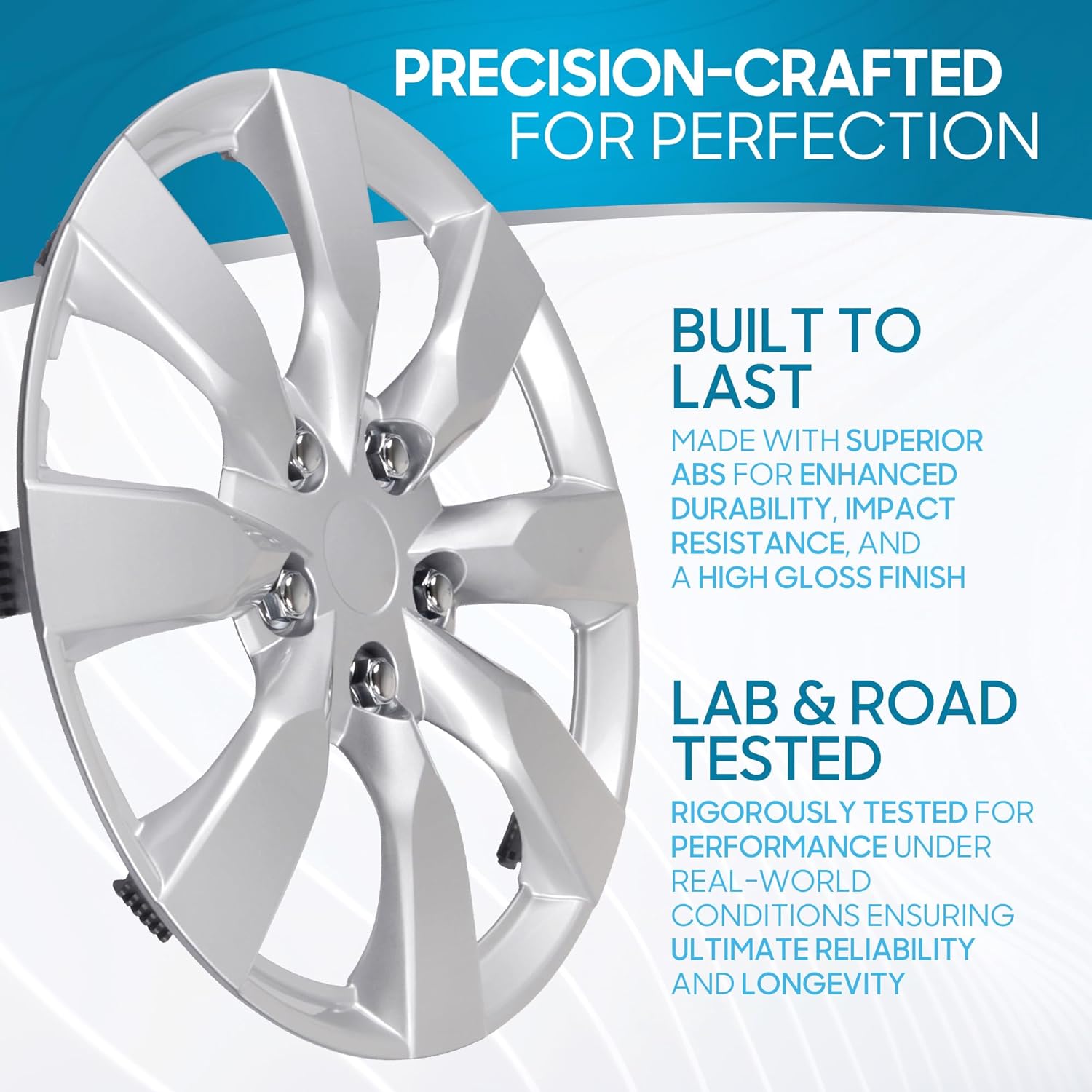 ENHANCE YOUR RIDE – Transform your car’s appearance with sleek, stylish hubcaps that are as easy to install as they are to admire. Save time and money with our snap-on hubcaps that provide a premium look and performance without the extra cost.