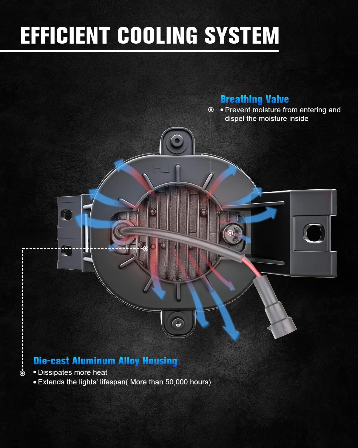 High Brightness: It is 2500LM per light, 6000K color temperature( pure white) on this 3500 fog light. Without dark spots or shadowed areas, higher color temperature and a much wider field of light dispersion than stock halogen lamps