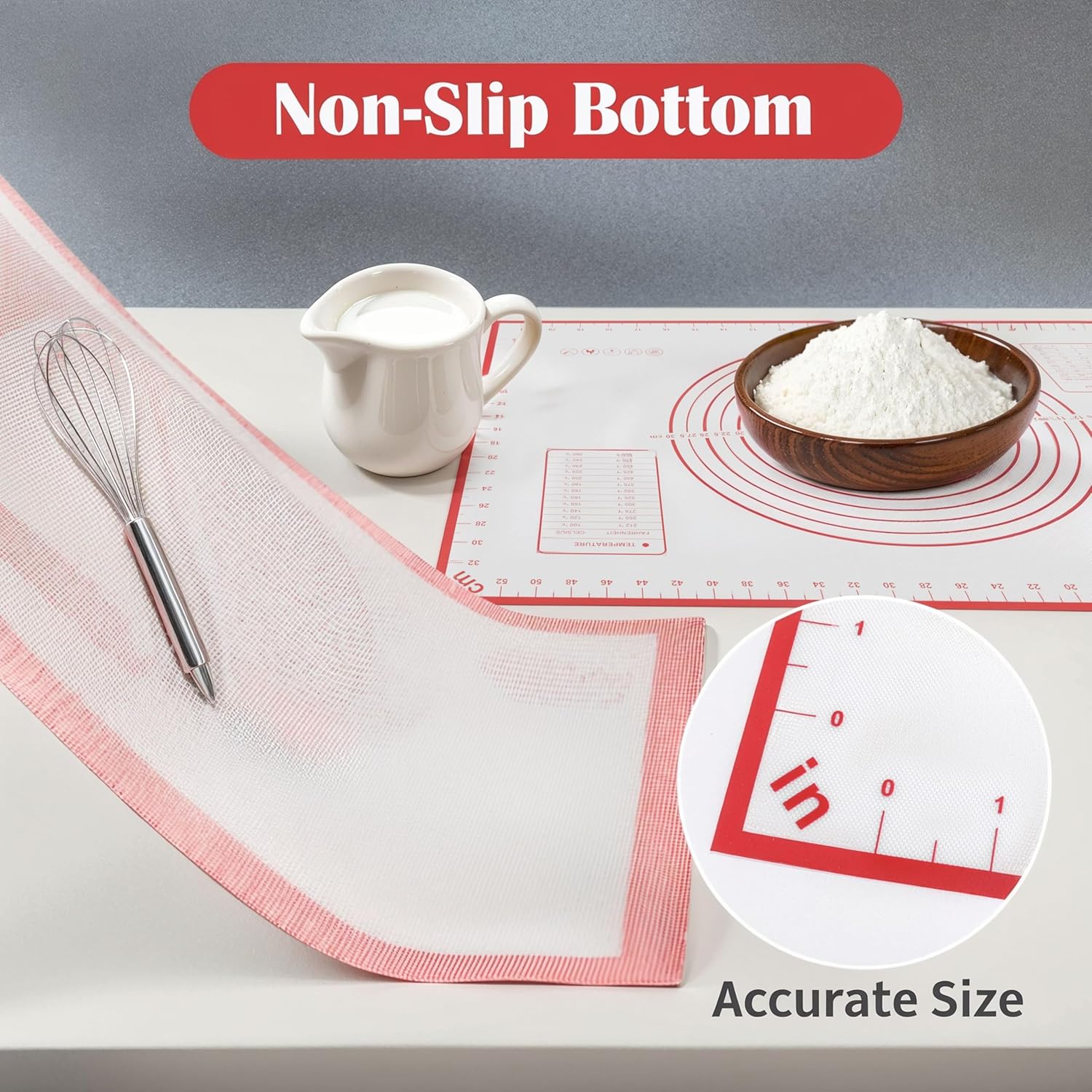 【Easy to Clean & Baking Essentials】:You will be satisfied with the quality of this kitchen baking helper, easy to clean and roll up, can be reused for a long time, a perfect gift for baking lovers. Suitable for use in kitchens, RVs, in refrigerators, microwaves, dishwashers, for temperatures from -70°F ~ 464°F (-60°C ~ 240°C).. 【Durable & Non-Slip Bottom】:The non-slip bottom of the pastry mat will obediently stick to the tabletop, providing enough sassafras for non-slip as you knead the bread, and you can roll, knead, and cut the dough on the silicone baking mat.. 【Larger Size Options】:We have extra large silicone mats for you to choose from, longer and larger sizes to provide more surface area for your baking needs, making your bread making easier and more convenient….