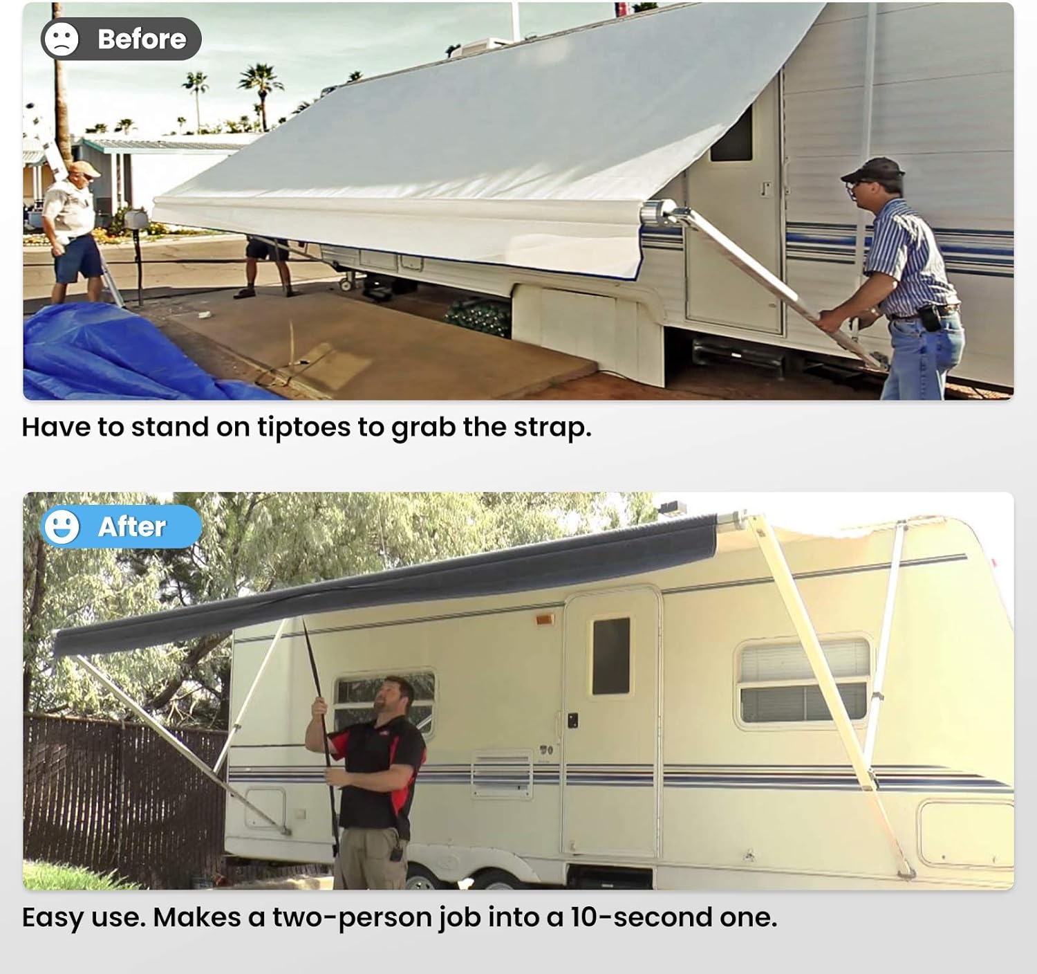 - Feature: Stronger pulling force straps and convenient reinforced loop. Made of wider and heavy-duty nylon strap than others. Easy to get your finger through. Prevents the strap from rolling up into the awning