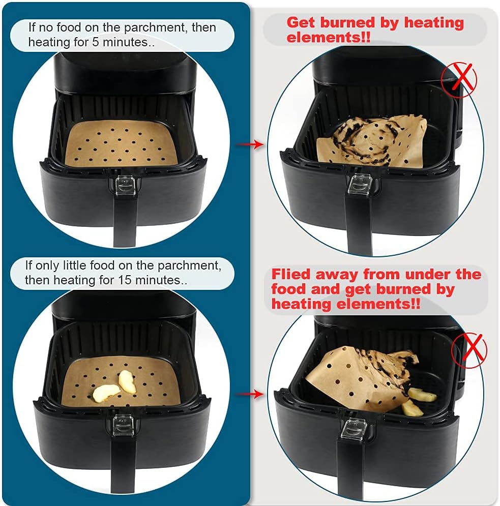- WARNING: Place enough food on the top of parchment before preheat your air fryer to avoid the parchment fly away and get burned by heating elements! The food should at least cover the 2/3 the area of the parchment