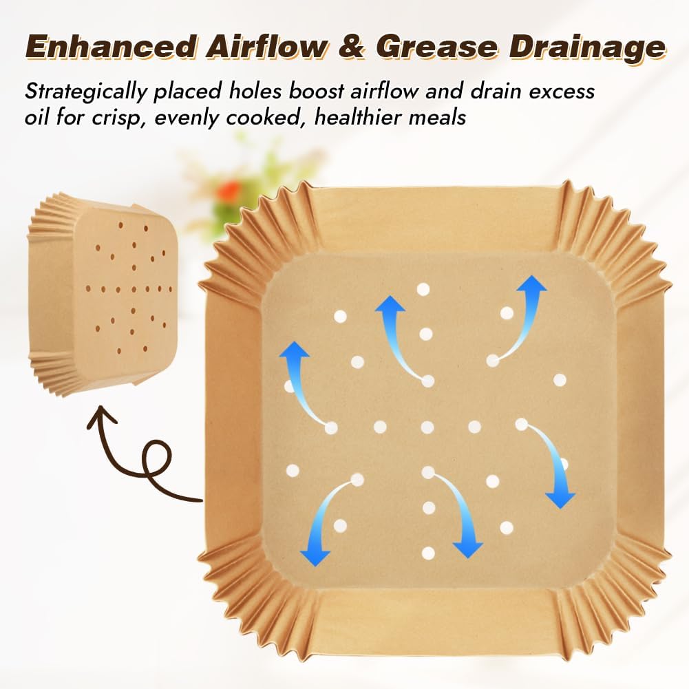 Crispier & Healthier Meals with Perforated Design: These air fryer parchment paper liners feature precision holes that boost airflow and drain excess grease—resulting in crispier, healthier meals every time