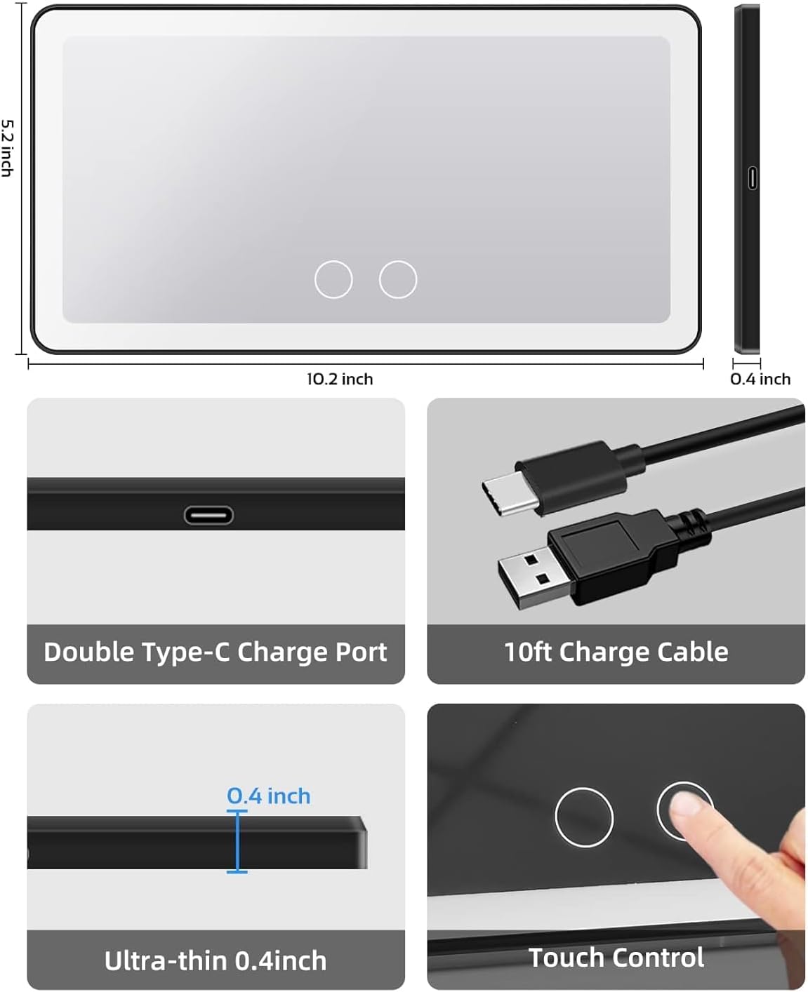 【USB Rechargeable】Built-in 2000 mAh lithium battery, which can be charged via the socket, computer, mobile power. Comes with 10ft USB cable, free to use the car mirror at anywhere and anytime. It can last 8 hours if 100% brightness while always on mode