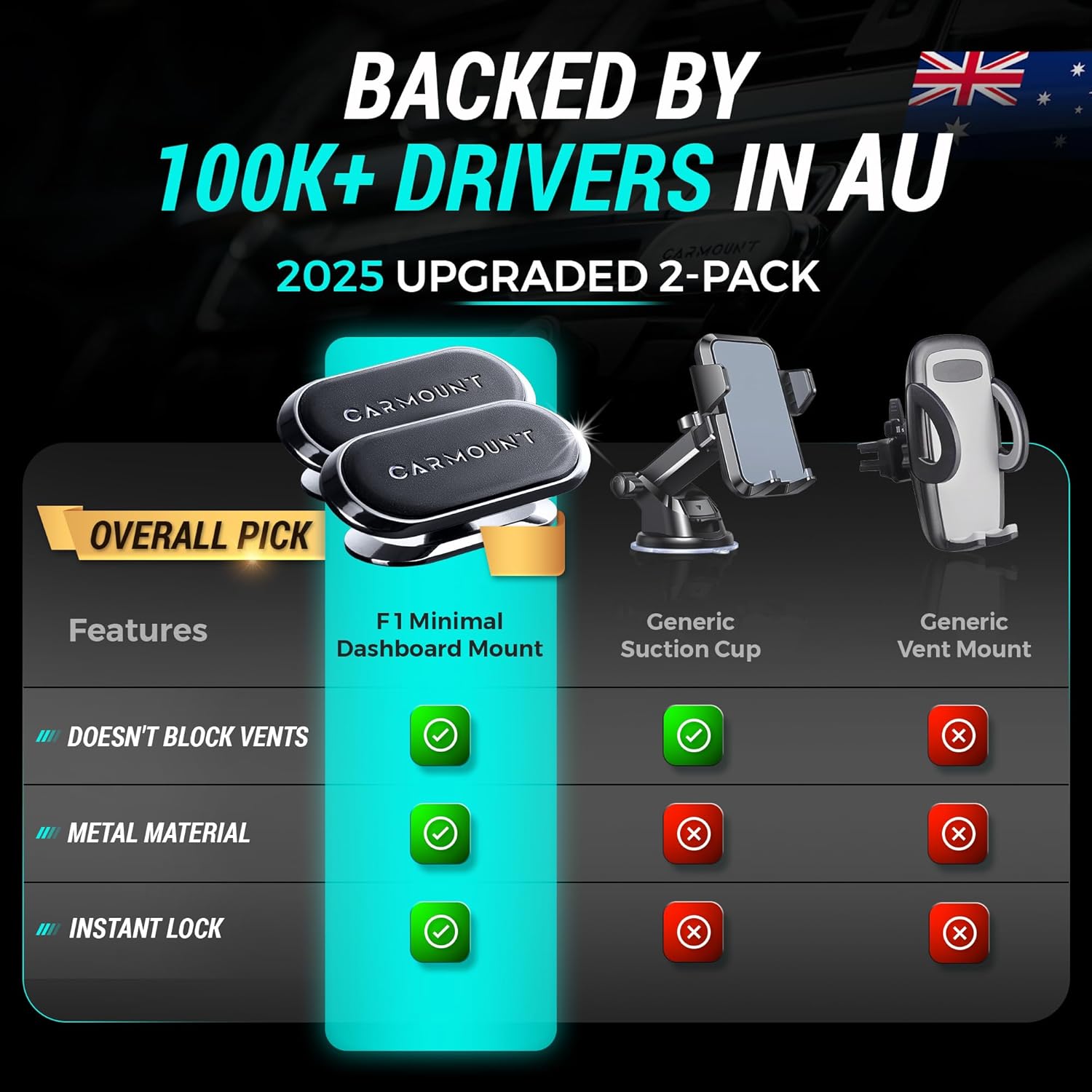 ELEGANT & COMPACT: Ditch the bulky, flimsy phone holders! Elevate your car’s interior with CarMount 1.0 F1’s sleek, minimalistic design. Crafted from 100% high-quality zinc alloy, this compact mount complements any dashboard without taking up much space. This pair of rotatable dashboard phone holders allows you to hold your cell phones without blocking air vents.. POWERFUL N52 MAGNET HOLD: Each F1 magnet phone holder for car comes equipped with 8 powerful N52 magnets, making it one of the strongest magnetic car mount options available. This car mount magnet offers a reliable grip that holds smartphones weighing up to 0.8 pounds. You can even use two mounts together to hold tablets! It stays secure over potholes, speed bumps, or off-road—trust us, we’ve tested it. The closed magnetic field won’t interfere with your phone’s signal or affect your device in any way.. FULL 360° ROTATION & 30° TILT: Achieve the perfect viewing angle every time with the swivel ball joint mechanism, offering full 360-degree rotation and 30-degree tilt. Effortlessly adjust your phone’s position for hands-free navigation or calls while driving, ensuring safer, more convenient use….