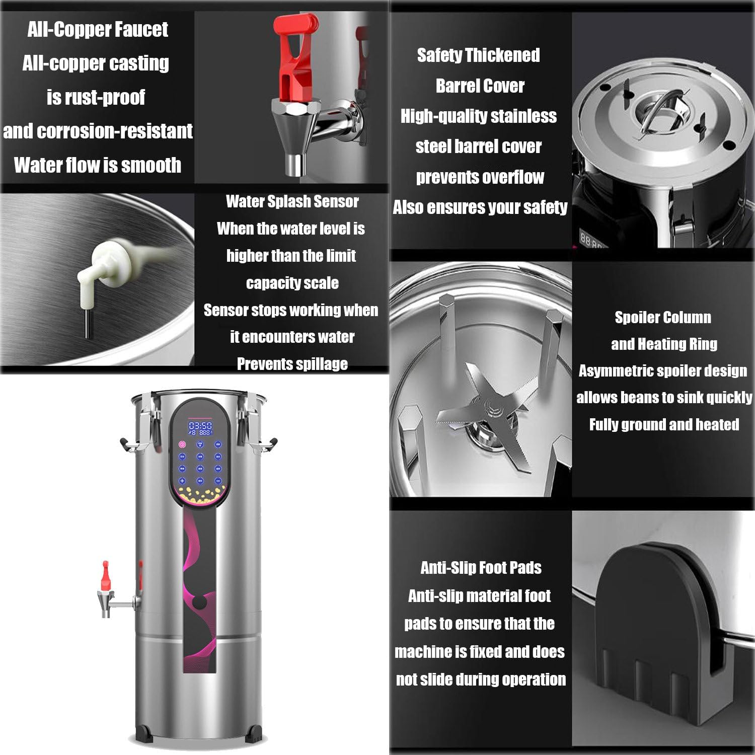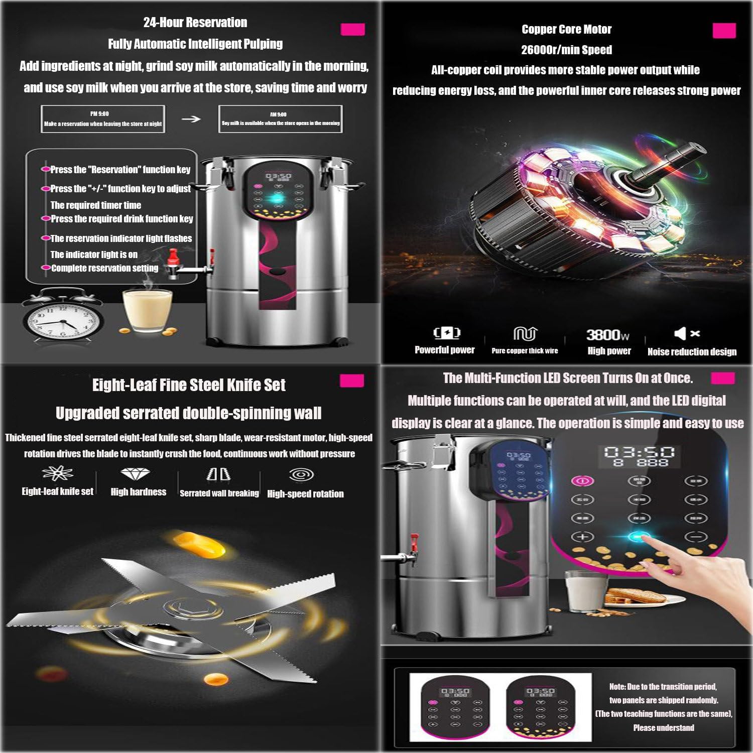 - ☀【Stainless Steel Automatic Soy Milk Grinder】: This Freshly Ground Soy Milk Machine Without Filter provides 24-hour reservation for fully automatic intelligent pulping, and the LED screen can be turned on with one button. It is suitable for breakfast shops, canteens, and units. It can make soy milk, corn juice, mung bean paste, whole grain porridge, and rice paste