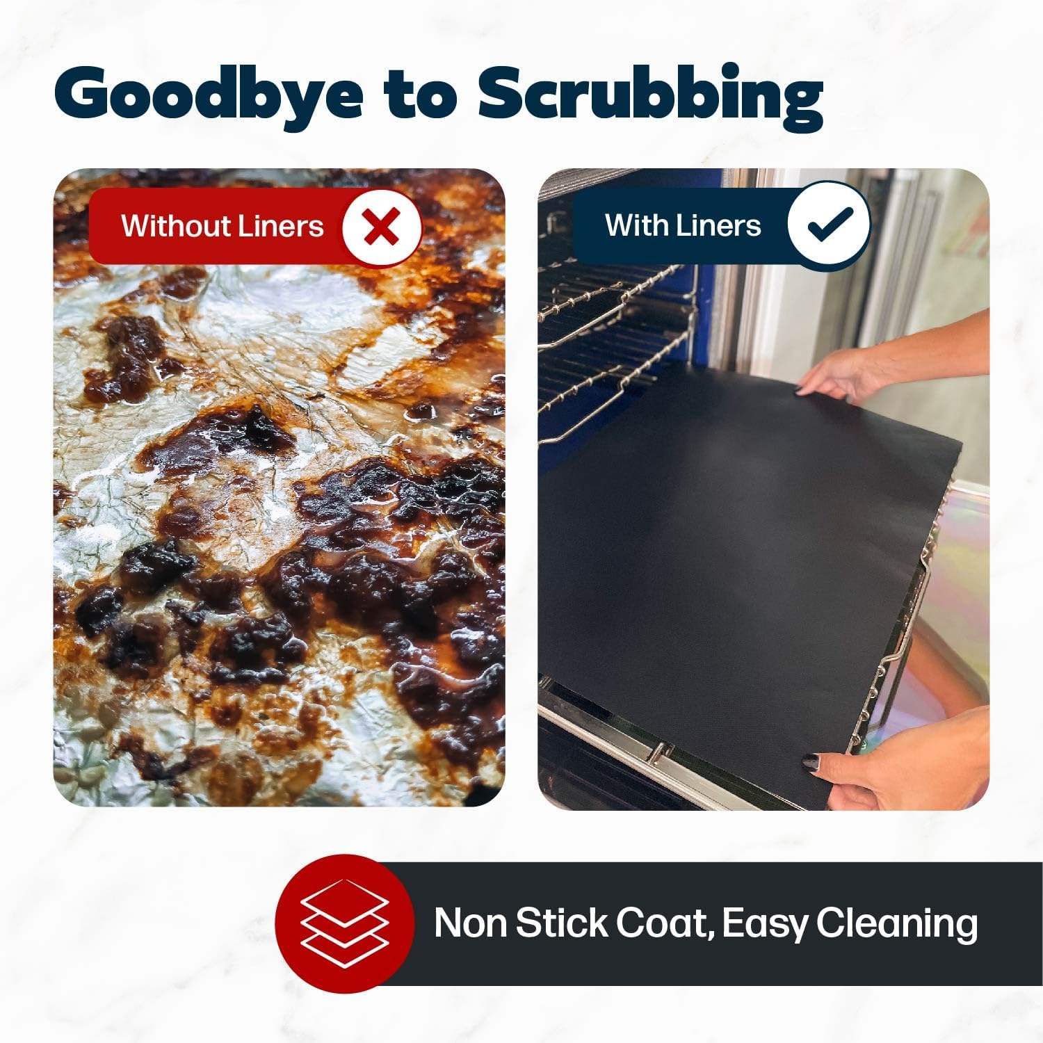 - DURABLE: Our 100% non-stick PTFE toaster oven tray lining keeps the bottom of your oven clean when placed on an oven rack below whatever you’re baking! Our oven guard protects your oven from spills, drops, and drips from pies, casseroles, pizza, and more before they burn and stick. Eliminate a tedious chore with our oven liner!