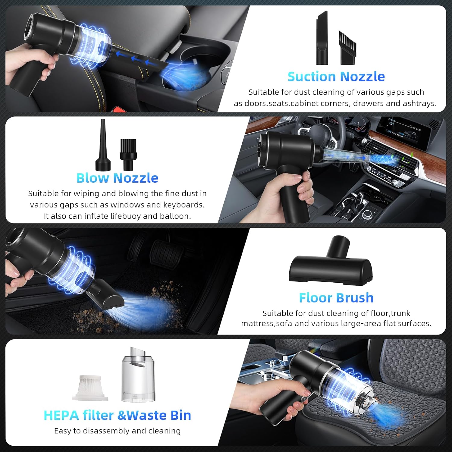 Powerful Air Duster and Vacuum Cleaner : This small vacuum cleaner cordless boasts strong suction power thanks to a high-speed motorized brush roll that easily lifts dirt, dust, and debris from floors, upholstery, and other surfaces.Also the portable handheld vacuum cordless can blow small equipment such as lifebuoy and balloon,the mini vacuum cleaner cordless can also clean the fine dust in various gaps such as windows and keyboards. The cordless vaccum for car also can be wiped and blown with a brush.. Versatile use: Beyond traditional hand vacuum, the handheld portable vacuum for car various attachments like the crevice tool and brush let you tackle hard-to-reach areas and delicate surfaces with ease.. Rechargeable Battery and Fast Charging: This mini car vacuum has 2 built-in 1800mAh battery ,It can be easily charged by using a car charger, adaptor charger, laptop, power bank and so on. The car vaccum takes only 3 hours to charge,and can keep for working 20-30 minutes ….