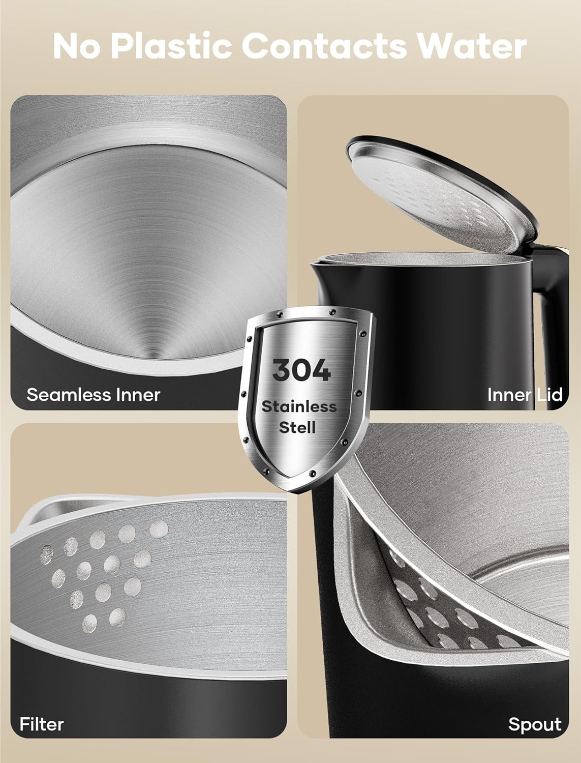Cool Touch Kettle for Family Safety: Anti-Scald Design, the double-wall kettle insulation keeps water hot longer while the exterior stays cool. Safe for making oatmeal before school or when kids grab a late-night hot chocolate—no burned hands.. Rapid 1500W Boiling in Just 6 Minutes: Bring 1.7L (8 cups) to a full 212°F boil in this efficient water boiler. The auto-shutoff LED lets you know when your water’s ready for coffee, hot tea or instant meals – no guessing needed.. Full 304 Stainless Steel Construction: Every water-contact surface – including the spout, lid and interior – is crafted from food-grade 304 stainless steel. Enjoy pure-tasting water for baby formula, with no plastic aftertaste or BPA concerns….