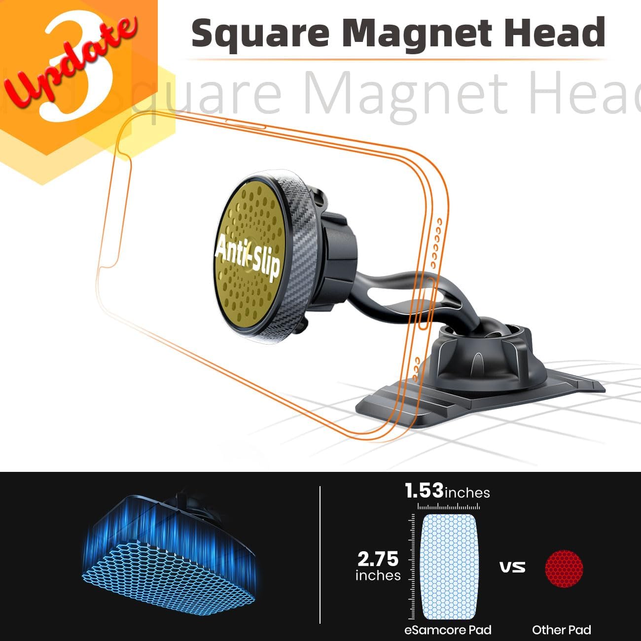 UPGRADED VIEWING ANGLE: Thanks to the Upgraded Double swivel ball joints, eSamcore magnetic car mount can be adjusted to an optimal viewing angle more easily. You can place this magnetic car phone holder on the top position or low position of the dashboard wherever you like.. UPGRADED FLEX MOUNT BASE: The Base of eSamcore phone holder for car was upgraded flexible and bigger. The bigger VHB adhesive base with flex tabs can be stuck on slightly curved or rough surfaces of your dashboard, providing stronger adhesion than other traditional dashboard car phone mount. [***The size of the mount base is 1.51 X 2.71 inch.***]. UPGRADED SQUARED MAGNET HEAD: Designed Anti-Slip squared magnet head helps to prevent cell phone slipping from magnetic car mount when driving on the bumpy road. Meanwhile upgraded 4 N52 neodymium magnets can maximize the magnetic force and keep your cell phone stable….