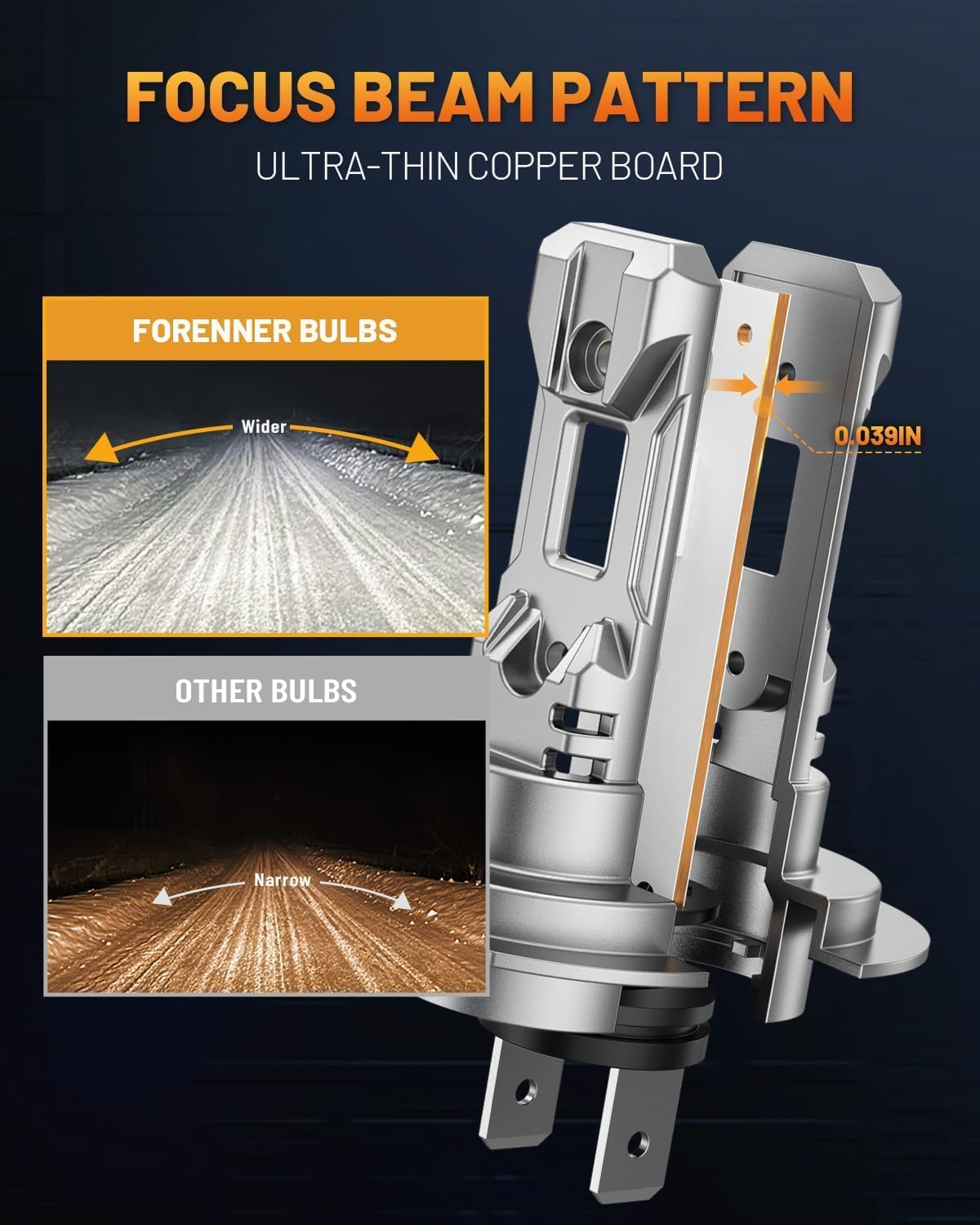 【Huge Improvement in Visibility】Forenner H7 fog light bulbs are equipped with Latest chips which provide 600% brighter than OEM bulbs, allowing you to see farther and react sooner. 6500K cool white light provides more comfortable and safer lighting.. 【3-Min Installation】Our H7 fog light bulb is designed 1:1 size with original bulbs, no extra adapter needed, no external driver, no extended bulb base, and no need to modify the dust cover. You can finish the installation in 3 minutes.. 【Perfect Beam Pattern】The H7 precisely mimics the position of the original bulb filament with 0.03in ultra-thin chip spacing just the same light pattern as stock bulbs to focus down the road with no dark spots or scattered light. Not dazzling to oncoming drivers….