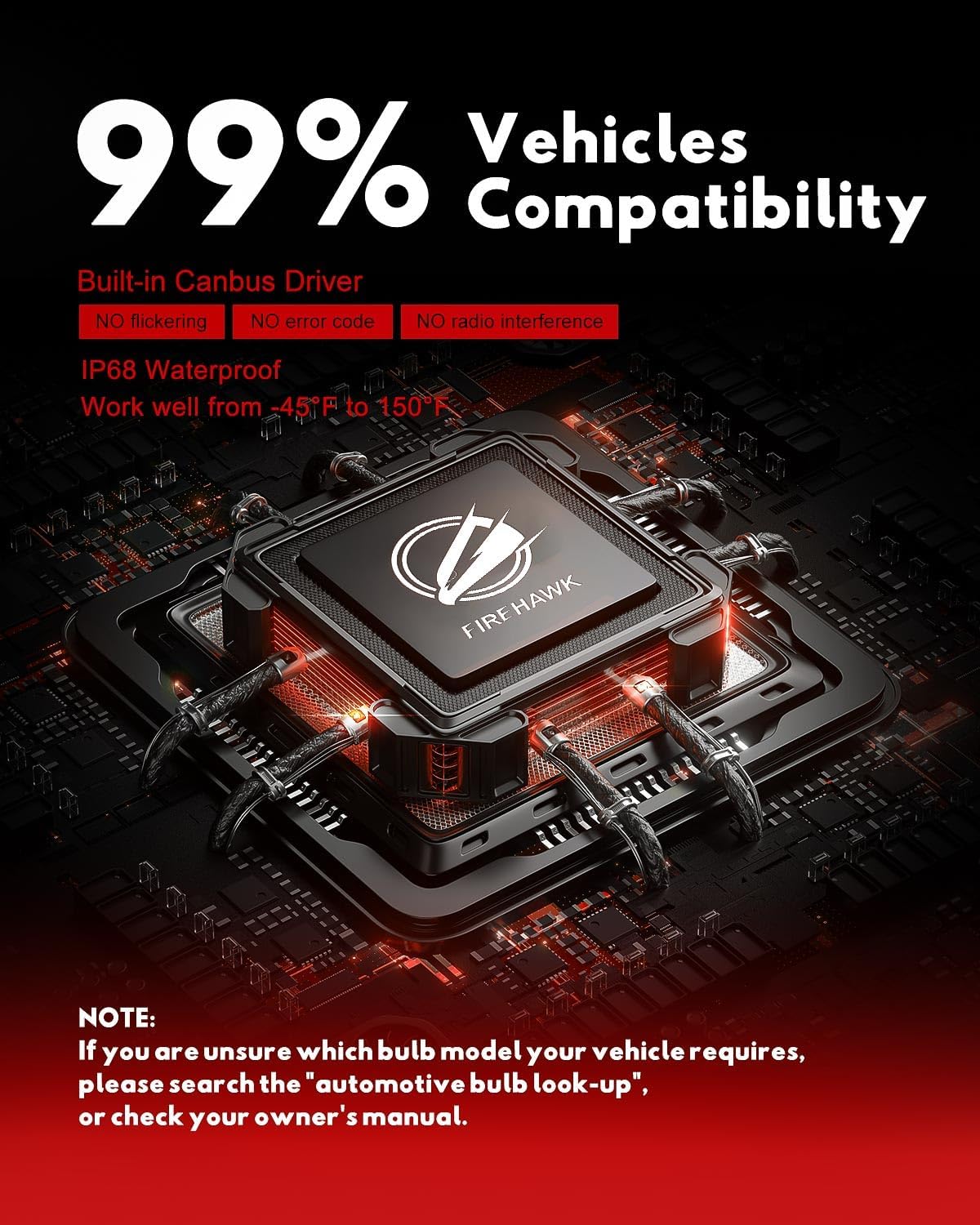 - 【70,000 Hours Lifespan】 2mm thickened red copper, 50mm copper heat pipes, 40pcs aviation aluminum heat sinks, 15,000RPM silent turbofan, IP68 Waterproof, these improved techs and materials make Firehawk bulbs work perfectly in any weather conditions including rain, snow, and extreme temperatures (-45°F to 300°F), even last longer than your vehicle.