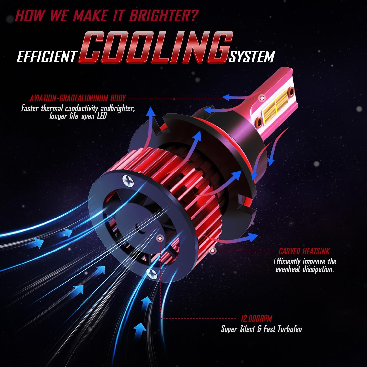- 【Over 5,0000 Hours Lifespan】- Our bulbs are made with aviation aluminum that is hollow carved and has a unique heat sink design and cool fan technology for better cooling. It ensures a longer lifespan of up to 50000 hours to give you peace of mind while driving.