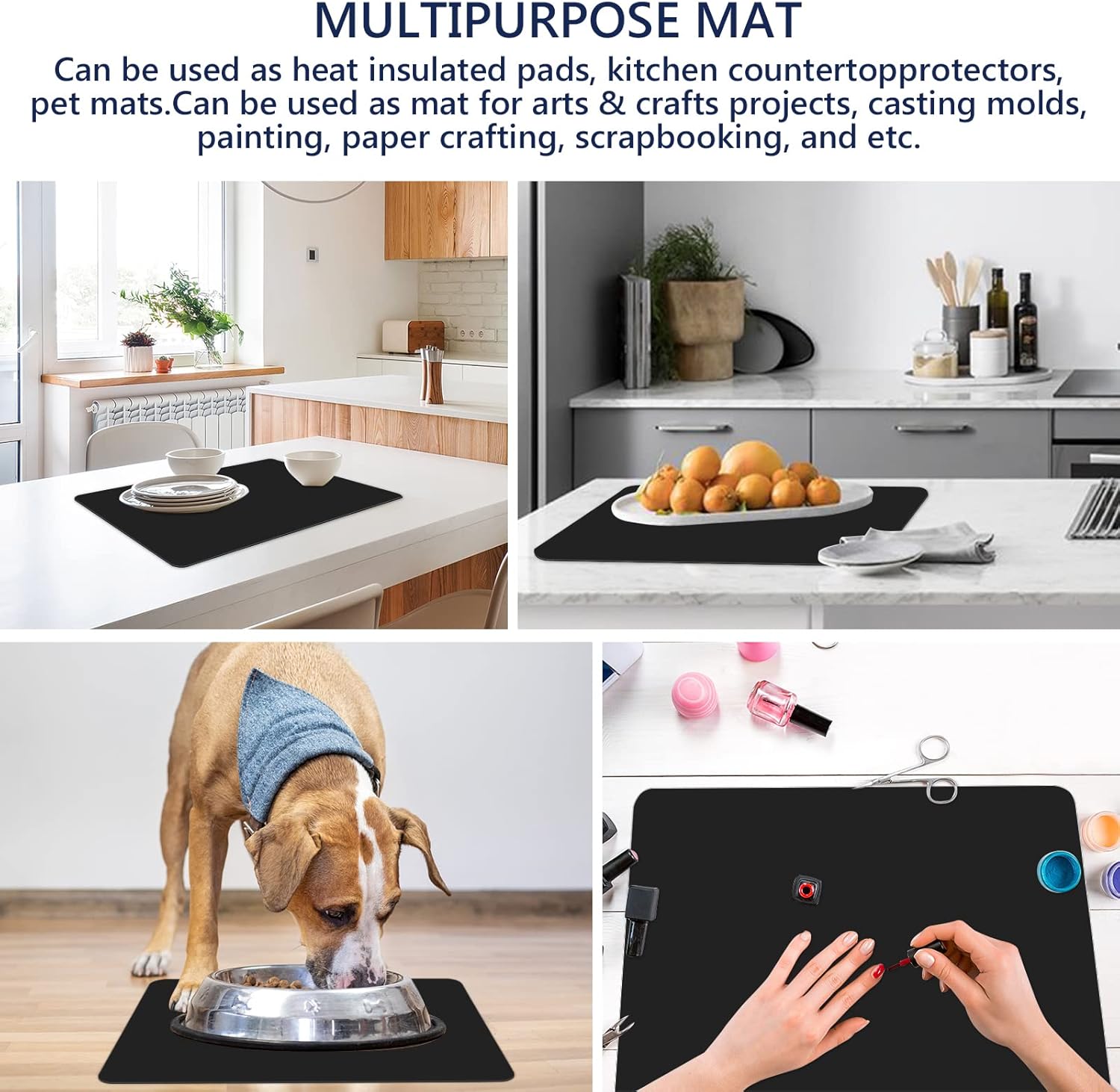 LARGE SIZE PLACEMAT – With non-skid backing design, 2 Pcs Black silicone pads measures 15.7 x 11.8 x 0.03 inches / 40 x 30 x 0.08 cm, perfect for baby / child feeding mat, keep the table clean. Tips: A side is smooth surface (face down), the other side is frosted (face up).. QUALITY MATERIAL – Silicone craft mat is made of 100 percent food grade silicone, heat resistant between -40℉ and 446℉. Durable and reusable, waterproof, non-slip, nonstick, non-fading, non-staining, not easy to deform or tear up, great for casting tools kit.. SURFACE PROTECTOR – Counter mat can protect your kitchen countertop against spills, water, stains, discolorations, scratches, burn, grease and keep your crafting table away from resin, epoxy, glue, glitter, paint, ink, oil, etc. Place it under microwaves, air fryer, induction stove, toaster, coffee maker oven among other appliances to protect the countertops….