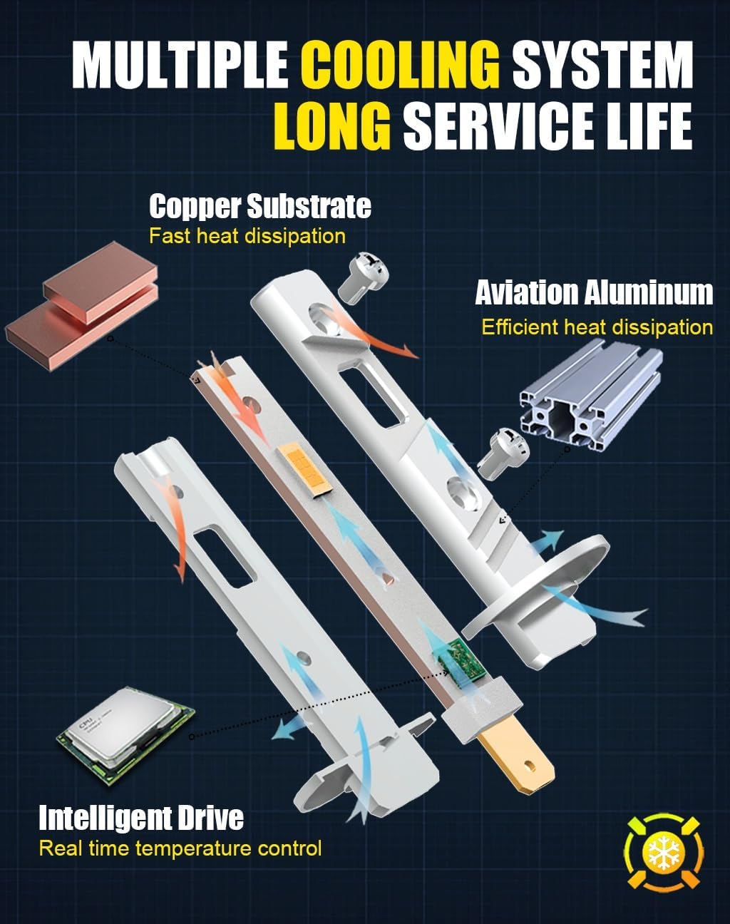 - Long Service Life: This Single Plug LED H1 bulb uses Multiple cooling technologies. Copper substrate and Aviation aluminum profile, heat transfer faster. Integrated Lamp Body, overall heat conduction. Intelligent temperature control driver, real-time temperature control.