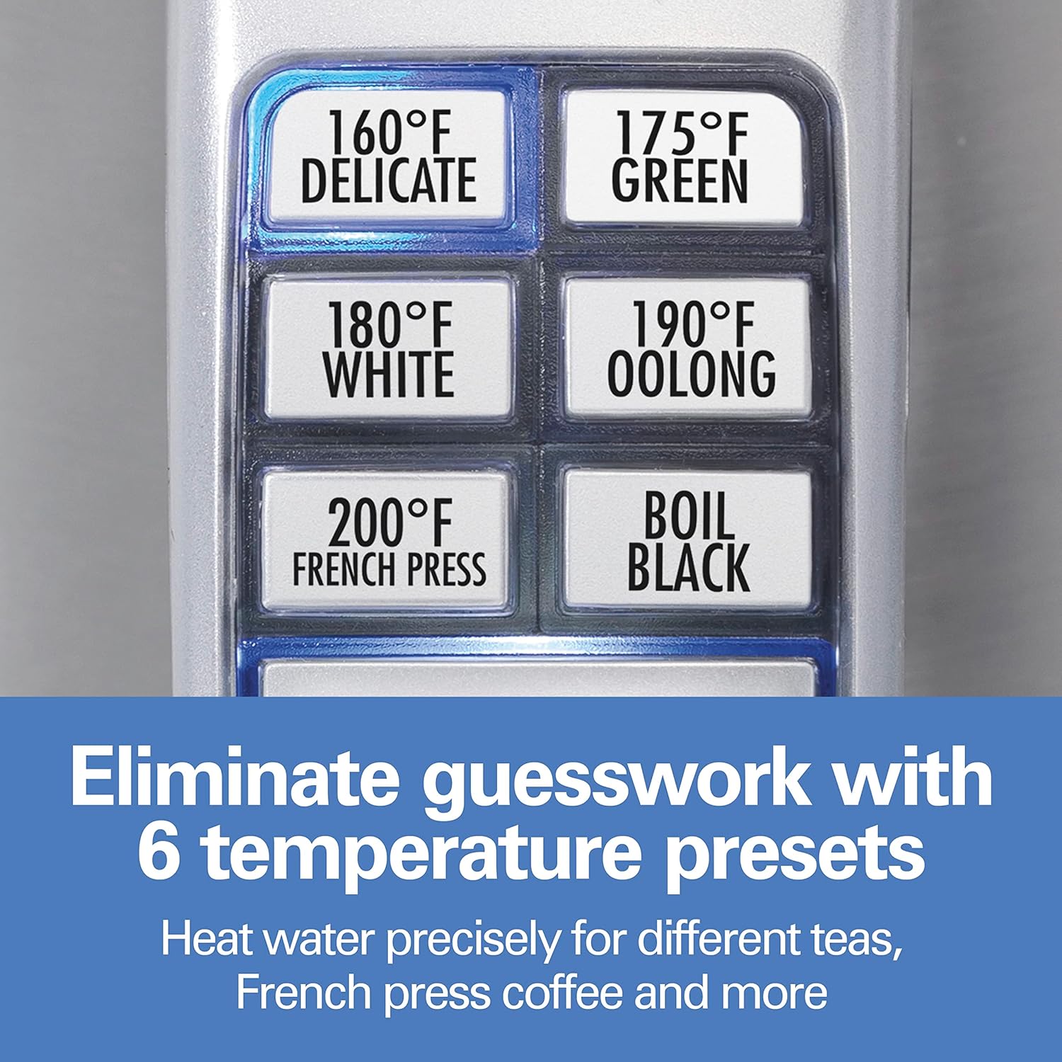 6 TEMPERATURE PRESETS. The variable temperature electric kettle brings water up to the perfect temperatures to make green, white, oolong, black and delicate herbal teas and French press coffee. The kettle beeps when the selected temperature is reached.. HOLD WATER AT YOUR SELECTED TEMPERATURE. Press the keep warm button to maintain the desired temperature for as long as 30 minutes or until the electric tea kettle is removed from the base for serving.. DURABLE, BPA-FREE, FOOD-GRADE STAINLESS STEEL INTERIOR: The BPA-free stainless steel interior of this electric water kettle provides years of long-lasting performance, is easy to clean and has a MAX fill line for easy filling….