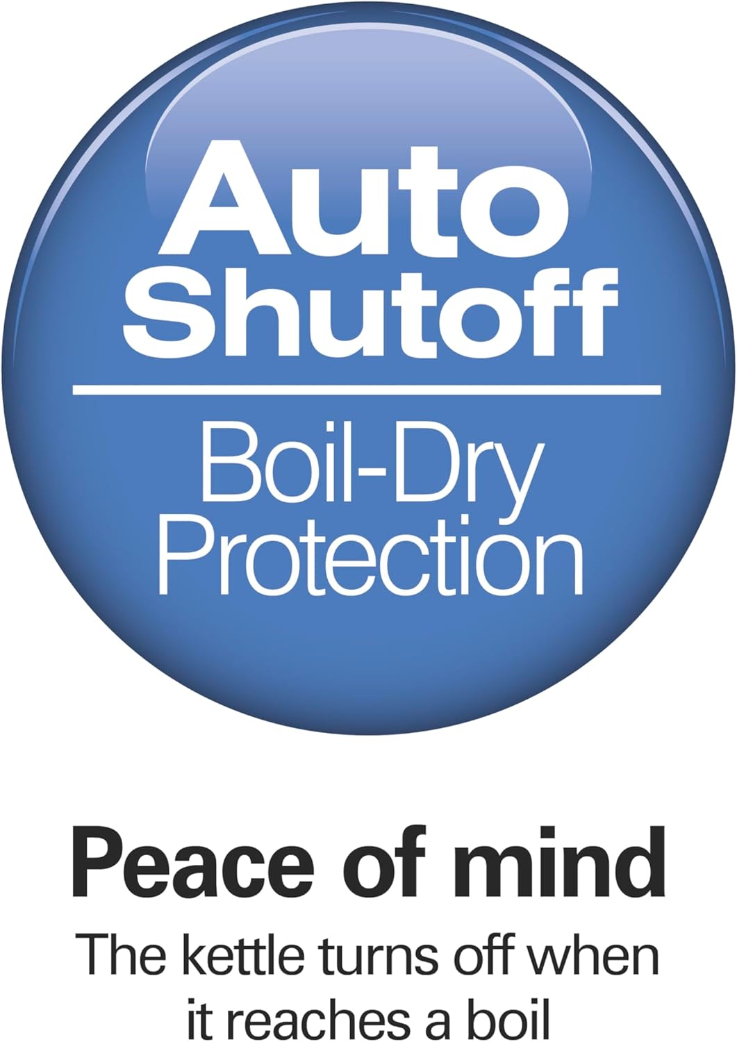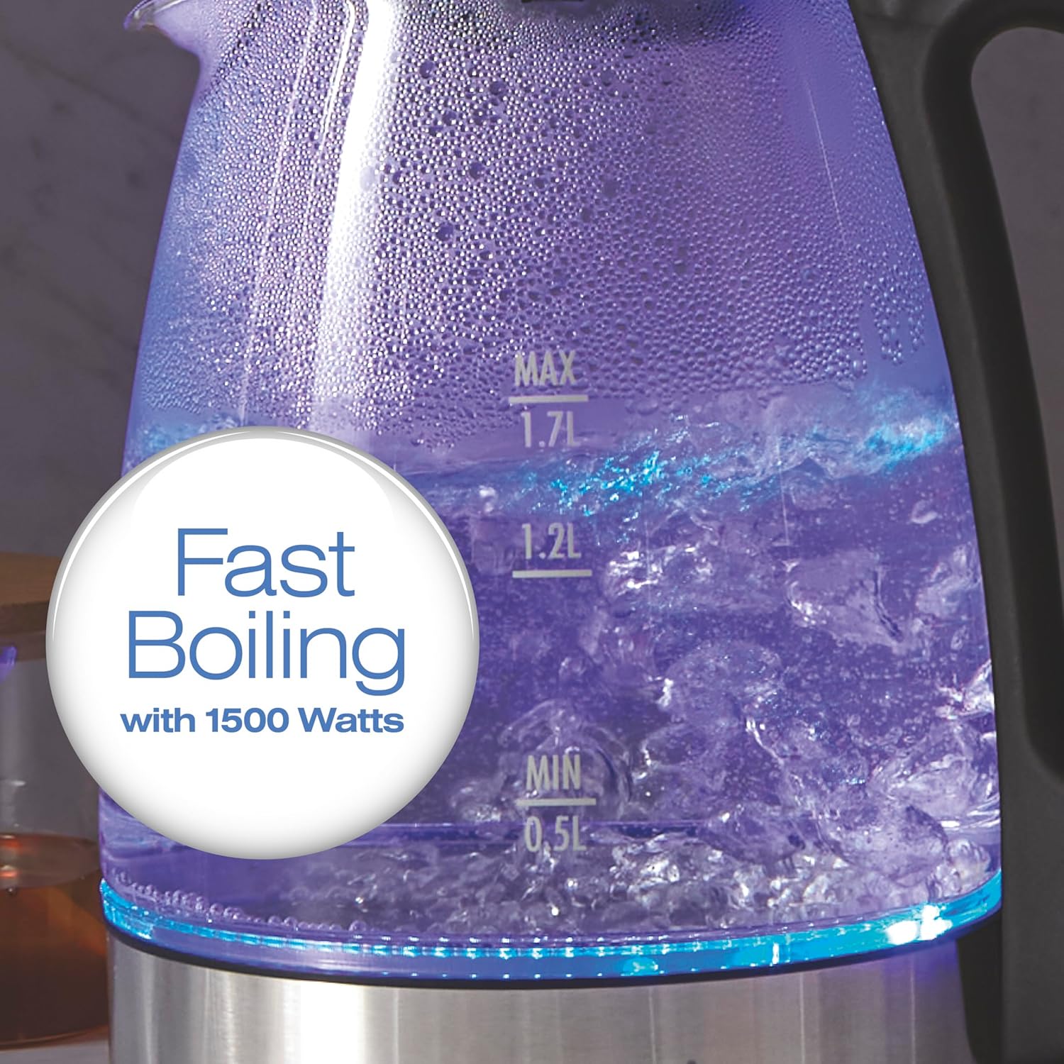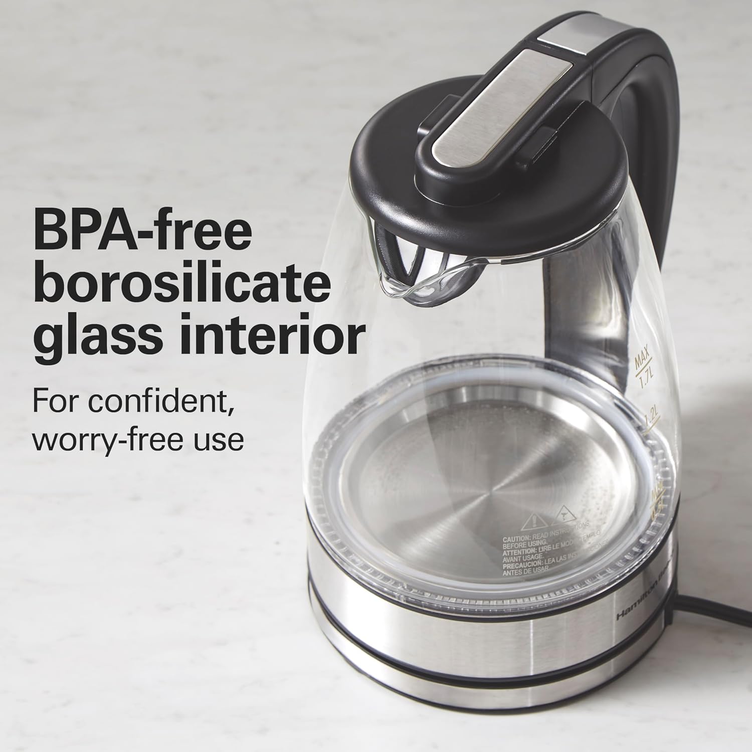 FAST BOILING WITH 1500 WATTS — This glass electric kettle boils up to 1.7 liters of water faster than a microwave and safer than a stovetop kettle. Make a quick cup of tea or French press coffee anytime without the long wait — perfect for hectic mornings.. BPA-FREE, BOROSILICATE GLASS INTERIOR: Whether you’re boiling water for hot beverages or making a quick batch of instant noodles, the interior is made of BPA-free borosilicate glass walls and a stainless steel heating plate for confident, worry-free use.. AUTO SHUTOFF FOR PEACE OF MIND. The Hamilton Beach electric kettle automatically turns off when it reaches a boil. Boil-dry protection keeps the kettle from scorching if water gets low….